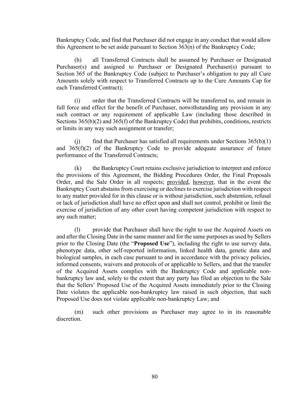 80 Bankruptcy Code, and find that Purchaser did not engage in any conduct that would allow this Agreement to be set aside pursuant to Section 363(n) of the Bankruptcy Code; (h) all Transferred Contracts shall be assumed by Purchaser or Designated Purchaser(s) and assigned to Purchaser or Designated Purchaser(s) pursuant to Section 365 of the Bankruptcy Code (subject to Purchaser’s obligation to pay all Cure Amounts solely with respect to Transferred Contracts up to the Cure Amounts Cap for each Transferred Contract); (i) order that the Transferred Contracts will be transferred to, and remain in full force and effect for the benefit of Purchaser, notwithstanding any provision in any such contract or any requirement of applicable Law (including those described in Sections 365(b)(2) and 365(f) of the Bankruptcy Code) that prohibits, conditions, restricts or limits in any way such assignment or transfer; (j) find that Purchaser has satisfied all requirements under Sections 365(b)(1) and 365(f)(2) of the Bankruptcy Code to provide adequate assurance of future performance of the Transferred Contracts; (k) the Bankruptcy Court retains exclusive jurisdiction to interpret and enforce the provisions of this Agreement, the Bidding Procedures Order, the Final Proposals Order, and the Sale Order in all respects; provided, however, that in the event the Bankruptcy Court abstains from exercising or declines to exercise jurisdiction with respect to any matter provided for in this clause or is without jurisdiction, such abstention, refusal or lack of jurisdiction shall have no effect upon and shall not control, prohibit or limit the exercise of jurisdiction of any other court having competent jurisdiction with respect to any such matter; (l) provide that Purchaser shall have the right to use the Acquired Assets on and after the Closing Date in the same manner and for the same purposes as used by Sellers prior to the Closing Date (the “Proposed Use”), including the right to use survey data, phenotype data, other self-reported information, linked health data, genetic data and biological samples, in each case pursuant to and in accordance with the privacy policies, informed consents, waivers and protocols of or applicable to Sellers, and that the transfer of the Acquired Assets complies with the Bankruptcy Code and applicable non- bankruptcy law and, solely to the extent that any party has filed an objection to the Sale that the Sellers’ Proposed Use of the Acquired Assets immediately prior to the Closing Date violates the applicable non-bankruptcy law raised in such objection, that such Proposed Use does not violate applicable non-bankruptcy Law; and (m) such other provisions as Purchaser may agree to in its reasonable discretion.