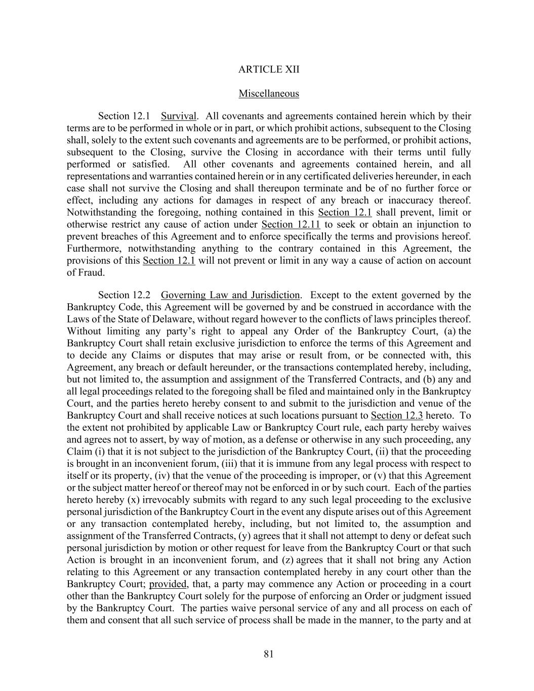 81 ARTICLE XII Miscellaneous Section 12.1 Survival. All covenants and agreements contained herein which by their terms are to be performed in whole or in part, or which prohibit actions, subsequent to the Closing shall, solely to the extent such covenants and agreements are to be performed, or prohibit actions, subsequent to the Closing, survive the Closing in accordance with their terms until fully performed or satisfied. All other covenants and agreements contained herein, and all representations and warranties contained herein or in any certificated deliveries hereunder, in each case shall not survive the Closing and shall thereupon terminate and be of no further force or effect, including any actions for damages in respect of any breach or inaccuracy thereof. Notwithstanding the foregoing, nothing contained in this Section 12.1 shall prevent, limit or otherwise restrict any cause of action under Section 12.11 to seek or obtain an injunction to prevent breaches of this Agreement and to enforce specifically the terms and provisions hereof. Furthermore, notwithstanding anything to the contrary contained in this Agreement, the provisions of this Section 12.1 will not prevent or limit in any way a cause of action on account of Fraud. Section 12.2 Governing Law and Jurisdiction. Except to the extent governed by the Bankruptcy Code, this Agreement will be governed by and be construed in accordance with the Laws of the State of Delaware, without regard however to the conflicts of laws principles thereof. Without limiting any party’s right to appeal any Order of the Bankruptcy Court, (a) the Bankruptcy Court shall retain exclusive jurisdiction to enforce the terms of this Agreement and to decide any Claims or disputes that may arise or result from, or be connected with, this Agreement, any breach or default hereunder, or the transactions contemplated hereby, including, but not limited to, the assumption and assignment of the Transferred Contracts, and (b) any and all legal proceedings related to the foregoing shall be filed and maintained only in the Bankruptcy Court, and the parties hereto hereby consent to and submit to the jurisdiction and venue of the Bankruptcy Court and shall receive notices at such locations pursuant to Section 12.3 hereto. To the extent not prohibited by applicable Law or Bankruptcy Court rule, each party hereby waives and agrees not to assert, by way of motion, as a defense or otherwise in any such proceeding, any Claim (i) that it is not subject to the jurisdiction of the Bankruptcy Court, (ii) that the proceeding is brought in an inconvenient forum, (iii) that it is immune from any legal process with respect to itself or its property, (iv) that the venue of the proceeding is improper, or (v) that this Agreement or the subject matter hereof or thereof may not be enforced in or by such court. Each of the parties hereto hereby (x) irrevocably submits with regard to any such legal proceeding to the exclusive personal jurisdiction of the Bankruptcy Court in the event any dispute arises out of this Agreement or any transaction contemplated hereby, including, but not limited to, the assumption and assignment of the Transferred Contracts, (y) agrees that it shall not attempt to deny or defeat such personal jurisdiction by motion or other request for leave from the Bankruptcy Court or that such Action is brought in an inconvenient forum, and (z) agrees that it shall not bring any Action relating to this Agreement or any transaction contemplated hereby in any court other than the Bankruptcy Court; provided, that, a party may commence any Action or proceeding in a court other than the Bankruptcy Court solely for the purpose of enforcing an Order or judgment issued by the Bankruptcy Court. The parties waive personal service of any and all process on each of them and consent that all such service of process shall be made in the manner, to the party and at