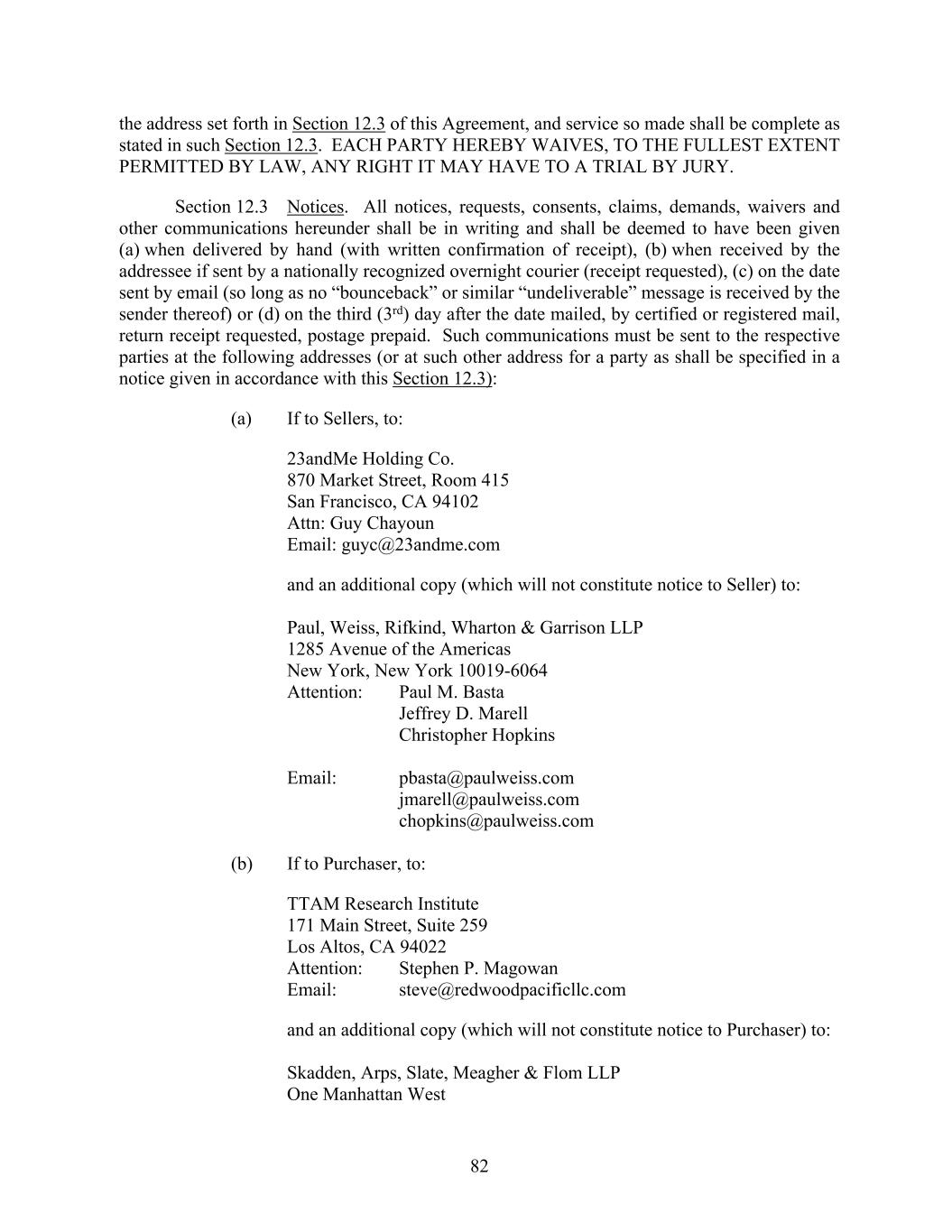82 the address set forth in Section 12.3 of this Agreement, and service so made shall be complete as stated in such Section 12.3. EACH PARTY HEREBY WAIVES, TO THE FULLEST EXTENT PERMITTED BY LAW, ANY RIGHT IT MAY HAVE TO A TRIAL BY JURY. Section 12.3 Notices. All notices, requests, consents, claims, demands, waivers and other communications hereunder shall be in writing and shall be deemed to have been given (a) when delivered by hand (with written confirmation of receipt), (b) when received by the addressee if sent by a nationally recognized overnight courier (receipt requested), (c) on the date sent by email (so long as no “bounceback” or similar “undeliverable” message is received by the sender thereof) or (d) on the third (3rd) day after the date mailed, by certified or registered mail, return receipt requested, postage prepaid. Such communications must be sent to the respective parties at the following addresses (or at such other address for a party as shall be specified in a notice given in accordance with this Section 12.3): (a) If to Sellers, to: 23andMe Holding Co. 870 Market Street, Room 415 San Francisco, CA 94102 Attn: Guy Chayoun Email: guyc@23andme.com and an additional copy (which will not constitute notice to Seller) to: Paul, Weiss, Rifkind, Wharton & Garrison LLP 1285 Avenue of the Americas New York, New York 10019-6064 Attention: Paul M. Basta Jeffrey D. Marell Christopher Hopkins Email: pbasta@paulweiss.com jmarell@paulweiss.com chopkins@paulweiss.com (b) If to Purchaser, to: TTAM Research Institute 171 Main Street, Suite 259 Los Altos, CA 94022 Attention: Stephen P. Magowan Email: steve@redwoodpacificllc.com and an additional copy (which will not constitute notice to Purchaser) to: Skadden, Arps, Slate, Meagher & Flom LLP One Manhattan West