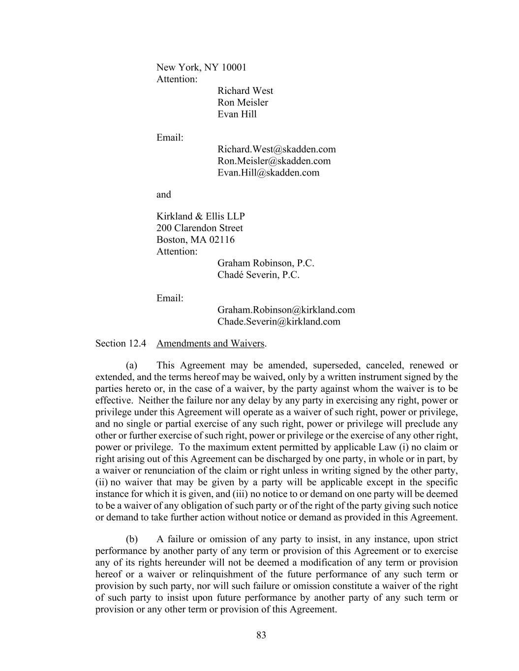 83 New York, NY 10001 Attention: Richard West Ron Meisler Evan Hill Email: Richard.West@skadden.com Ron.Meisler@skadden.com Evan.Hill@skadden.com and Kirkland & Ellis LLP 200 Clarendon Street Boston, MA 02116 Attention: Graham Robinson, P.C. Chadé Severin, P.C. Email: Graham.Robinson@kirkland.com Chade.Severin@kirkland.com Section 12.4 Amendments and Waivers. (a) This Agreement may be amended, superseded, canceled, renewed or extended, and the terms hereof may be waived, only by a written instrument signed by the parties hereto or, in the case of a waiver, by the party against whom the waiver is to be effective. Neither the failure nor any delay by any party in exercising any right, power or privilege under this Agreement will operate as a waiver of such right, power or privilege, and no single or partial exercise of any such right, power or privilege will preclude any other or further exercise of such right, power or privilege or the exercise of any other right, power or privilege. To the maximum extent permitted by applicable Law (i) no claim or right arising out of this Agreement can be discharged by one party, in whole or in part, by a waiver or renunciation of the claim or right unless in writing signed by the other party, (ii) no waiver that may be given by a party will be applicable except in the specific instance for which it is given, and (iii) no notice to or demand on one party will be deemed to be a waiver of any obligation of such party or of the right of the party giving such notice or demand to take further action without notice or demand as provided in this Agreement. (b) A failure or omission of any party to insist, in any instance, upon strict performance by another party of any term or provision of this Agreement or to exercise any of its rights hereunder will not be deemed a modification of any term or provision hereof or a waiver or relinquishment of the future performance of any such term or provision by such party, nor will such failure or omission constitute a waiver of the right of such party to insist upon future performance by another party of any such term or provision or any other term or provision of this Agreement.