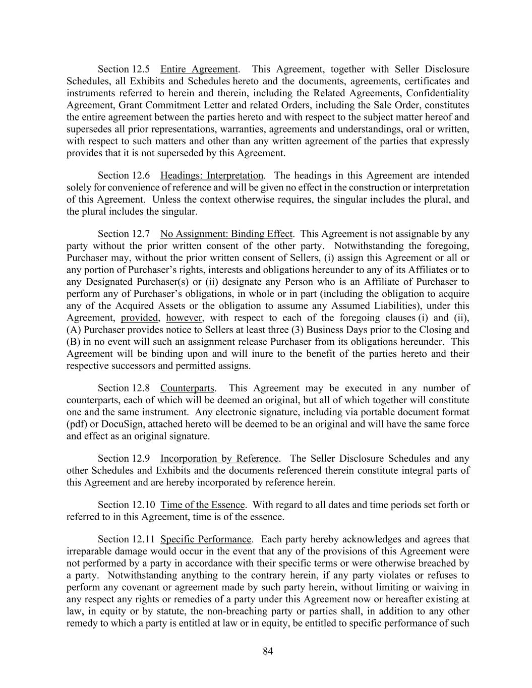 84 Section 12.5 Entire Agreement. This Agreement, together with Seller Disclosure Schedules, all Exhibits and Schedules hereto and the documents, agreements, certificates and instruments referred to herein and therein, including the Related Agreements, Confidentiality Agreement, Grant Commitment Letter and related Orders, including the Sale Order, constitutes the entire agreement between the parties hereto and with respect to the subject matter hereof and supersedes all prior representations, warranties, agreements and understandings, oral or written, with respect to such matters and other than any written agreement of the parties that expressly provides that it is not superseded by this Agreement. Section 12.6 Headings: Interpretation. The headings in this Agreement are intended solely for convenience of reference and will be given no effect in the construction or interpretation of this Agreement. Unless the context otherwise requires, the singular includes the plural, and the plural includes the singular. Section 12.7 No Assignment: Binding Effect. This Agreement is not assignable by any party without the prior written consent of the other party. Notwithstanding the foregoing, Purchaser may, without the prior written consent of Sellers, (i) assign this Agreement or all or any portion of Purchaser’s rights, interests and obligations hereunder to any of its Affiliates or to any Designated Purchaser(s) or (ii) designate any Person who is an Affiliate of Purchaser to perform any of Purchaser’s obligations, in whole or in part (including the obligation to acquire any of the Acquired Assets or the obligation to assume any Assumed Liabilities), under this Agreement, provided, however, with respect to each of the foregoing clauses (i) and (ii), (A) Purchaser provides notice to Sellers at least three (3) Business Days prior to the Closing and (B) in no event will such an assignment release Purchaser from its obligations hereunder. This Agreement will be binding upon and will inure to the benefit of the parties hereto and their respective successors and permitted assigns. Section 12.8 Counterparts. This Agreement may be executed in any number of counterparts, each of which will be deemed an original, but all of which together will constitute one and the same instrument. Any electronic signature, including via portable document format (pdf) or DocuSign, attached hereto will be deemed to be an original and will have the same force and effect as an original signature. Section 12.9 Incorporation by Reference. The Seller Disclosure Schedules and any other Schedules and Exhibits and the documents referenced therein constitute integral parts of this Agreement and are hereby incorporated by reference herein. Section 12.10 Time of the Essence. With regard to all dates and time periods set forth or referred to in this Agreement, time is of the essence. Section 12.11 Specific Performance. Each party hereby acknowledges and agrees that irreparable damage would occur in the event that any of the provisions of this Agreement were not performed by a party in accordance with their specific terms or were otherwise breached by a party. Notwithstanding anything to the contrary herein, if any party violates or refuses to perform any covenant or agreement made by such party herein, without limiting or waiving in any respect any rights or remedies of a party under this Agreement now or hereafter existing at law, in equity or by statute, the non-breaching party or parties shall, in addition to any other remedy to which a party is entitled at law or in equity, be entitled to specific performance of such