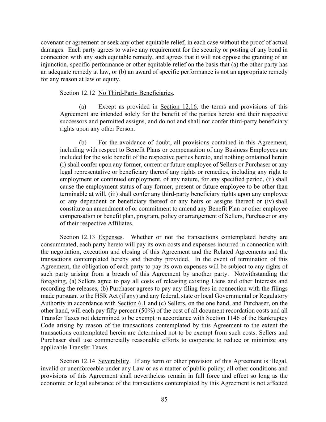 85 covenant or agreement or seek any other equitable relief, in each case without the proof of actual damages. Each party agrees to waive any requirement for the security or posting of any bond in connection with any such equitable remedy, and agrees that it will not oppose the granting of an injunction, specific performance or other equitable relief on the basis that (a) the other party has an adequate remedy at law, or (b) an award of specific performance is not an appropriate remedy for any reason at law or equity. Section 12.12 No Third-Party Beneficiaries. (a) Except as provided in Section 12.16, the terms and provisions of this Agreement are intended solely for the benefit of the parties hereto and their respective successors and permitted assigns, and do not and shall not confer third-party beneficiary rights upon any other Person. (b) For the avoidance of doubt, all provisions contained in this Agreement, including with respect to Benefit Plans or compensation of any Business Employees are included for the sole benefit of the respective parties hereto, and nothing contained herein (i) shall confer upon any former, current or future employee of Sellers or Purchaser or any legal representative or beneficiary thereof any rights or remedies, including any right to employment or continued employment, of any nature, for any specified period, (ii) shall cause the employment status of any former, present or future employee to be other than terminable at will, (iii) shall confer any third-party beneficiary rights upon any employee or any dependent or beneficiary thereof or any heirs or assigns thereof or (iv) shall constitute an amendment of or commitment to amend any Benefit Plan or other employee compensation or benefit plan, program, policy or arrangement of Sellers, Purchaser or any of their respective Affiliates. Section 12.13 Expenses. Whether or not the transactions contemplated hereby are consummated, each party hereto will pay its own costs and expenses incurred in connection with the negotiation, execution and closing of this Agreement and the Related Agreements and the transactions contemplated hereby and thereby provided. In the event of termination of this Agreement, the obligation of each party to pay its own expenses will be subject to any rights of such party arising from a breach of this Agreement by another party. Notwithstanding the foregoing, (a) Sellers agree to pay all costs of releasing existing Liens and other Interests and recording the releases, (b) Purchaser agrees to pay any filing fees in connection with the filings made pursuant to the HSR Act (if any) and any federal, state or local Governmental or Regulatory Authority in accordance with Section 6.1 and (c) Sellers, on the one hand, and Purchaser, on the other hand, will each pay fifty percent (50%) of the cost of all document recordation costs and all Transfer Taxes not determined to be exempt in accordance with Section 1146 of the Bankruptcy Code arising by reason of the transactions contemplated by this Agreement to the extent the transactions contemplated herein are determined not to be exempt from such costs. Sellers and Purchaser shall use commercially reasonable efforts to cooperate to reduce or minimize any applicable Transfer Taxes. Section 12.14 Severability. If any term or other provision of this Agreement is illegal, invalid or unenforceable under any Law or as a matter of public policy, all other conditions and provisions of this Agreement shall nevertheless remain in full force and effect so long as the economic or legal substance of the transactions contemplated by this Agreement is not affected
