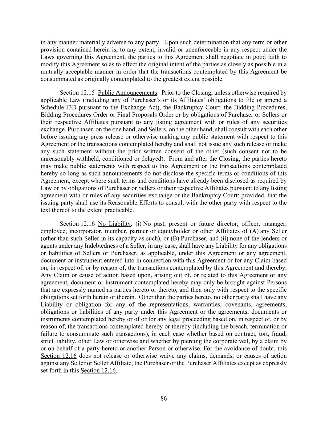 86 in any manner materially adverse to any party. Upon such determination that any term or other provision contained herein is, to any extent, invalid or unenforceable in any respect under the Laws governing this Agreement, the parties to this Agreement shall negotiate in good faith to modify this Agreement so as to effect the original intent of the parties as closely as possible in a mutually acceptable manner in order that the transactions contemplated by this Agreement be consummated as originally contemplated to the greatest extent possible. Section 12.15 Public Announcements. Prior to the Closing, unless otherwise required by applicable Law (including any of Purchaser’s or its Affiliates’ obligations to file or amend a Schedule 13D pursuant to the Exchange Act), the Bankruptcy Court, the Bidding Procedures, Bidding Procedures Order or Final Proposals Order or by obligations of Purchaser or Sellers or their respective Affiliates pursuant to any listing agreement with or rules of any securities exchange, Purchaser, on the one hand, and Sellers, on the other hand, shall consult with each other before issuing any press release or otherwise making any public statement with respect to this Agreement or the transactions contemplated hereby and shall not issue any such release or make any such statement without the prior written consent of the other (such consent not to be unreasonably withheld, conditioned or delayed). From and after the Closing, the parties hereto may make public statements with respect to this Agreement or the transactions contemplated hereby so long as such announcements do not disclose the specific terms or conditions of this Agreement, except where such terms and conditions have already been disclosed as required by Law or by obligations of Purchaser or Sellers or their respective Affiliates pursuant to any listing agreement with or rules of any securities exchange or the Bankruptcy Court; provided, that the issuing party shall use its Reasonable Efforts to consult with the other party with respect to the text thereof to the extent practicable. Section 12.16 No Liability. (i) No past, present or future director, officer, manager, employee, incorporator, member, partner or equityholder or other Affiliates of (A) any Seller (other than such Seller in its capacity as such), or (B) Purchaser, and (ii) none of the lenders or agents under any Indebtedness of a Seller, in any case, shall have any Liability for any obligations or liabilities of Sellers or Purchaser, as applicable, under this Agreement or any agreement, document or instrument entered into in connection with this Agreement or for any Claim based on, in respect of, or by reason of, the transactions contemplated by this Agreement and thereby. Any Claim or cause of action based upon, arising out of, or related to this Agreement or any agreement, document or instrument contemplated hereby may only be brought against Persons that are expressly named as parties hereto or thereto, and then only with respect to the specific obligations set forth herein or therein. Other than the parties hereto, no other party shall have any Liability or obligation for any of the representations, warranties, covenants, agreements, obligations or liabilities of any party under this Agreement or the agreements, documents or instruments contemplated hereby or of or for any legal proceeding based on, in respect of, or by reason of, the transactions contemplated hereby or thereby (including the breach, termination or failure to consummate such transactions), in each case whether based on contract, tort, fraud, strict liability, other Law or otherwise and whether by piercing the corporate veil, by a claim by or on behalf of a party hereto or another Person or otherwise. For the avoidance of doubt, this Section 12.16 does not release or otherwise waive any claims, demands, or causes of action against any Seller or Seller Affiliate, the Purchaser or the Purchaser Affiliates except as expressly set forth in this Section 12.16.
