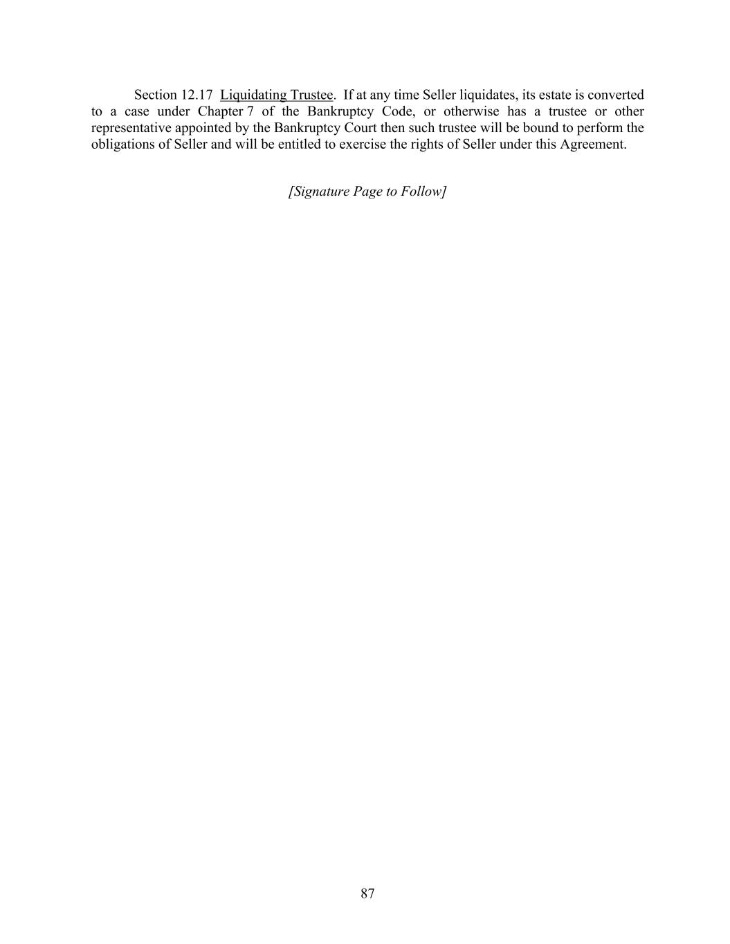 87 Section 12.17 Liquidating Trustee. If at any time Seller liquidates, its estate is converted to a case under Chapter 7 of the Bankruptcy Code, or otherwise has a trustee or other representative appointed by the Bankruptcy Court then such trustee will be bound to perform the obligations of Seller and will be entitled to exercise the rights of Seller under this Agreement. [Signature Page to Follow]
