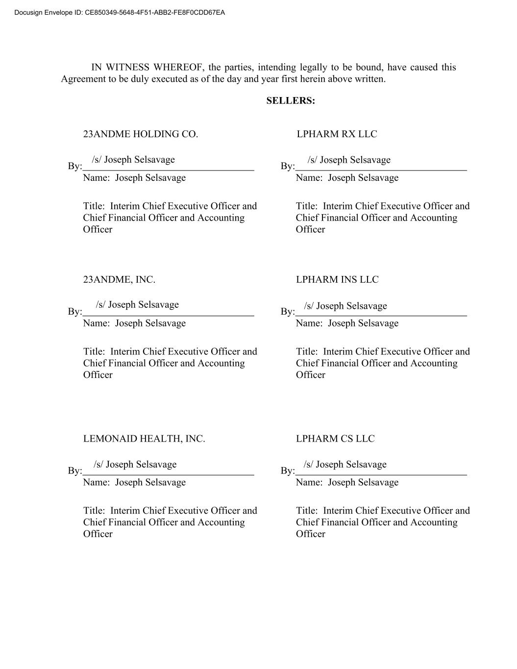 IN WITNESS WHEREOF, the parties, intending legally to be bound, have caused this Agreement to be duly executed as of the day and year first herein above written. SELLERS: 23ANDME HOLDING CO. By: Name: Joseph Selsavage Title: Interim Chief Executive Officer and Chief Financial Officer and Accounting Officer 23ANDME, INC. By: Name: Joseph Selsavage Title: Interim Chief Executive Officer and Chief Financial Officer and Accounting Officer LEMONAID HEALTH, INC. By: Name: Joseph Selsavage Title: Interim Chief Executive Officer and Chief Financial Officer and Accounting Officer LPHARM RX LLC By: Name: Joseph Selsavage Title: Interim Chief Executive Officer and Chief Financial Officer and Accounting Officer LPHARM INS LLC By: Name: Joseph Selsavage Title: Interim Chief Executive Officer and Chief Financial Officer and Accounting Officer LPHARM CS LLC By: Name: Joseph Selsavage Title: Interim Chief Executive Officer and Chief Financial Officer and Accounting Officer Docusign Envelope ID: CE850349-5648-4F51-ABB2-FE8F0CDD67EA /s/ Joseph Selsavage /s/ Joseph Selsavage /s/ Joseph Selsavage /s/ Joseph Selsavage /s/ Joseph Selsavage /s/ Joseph Selsavage