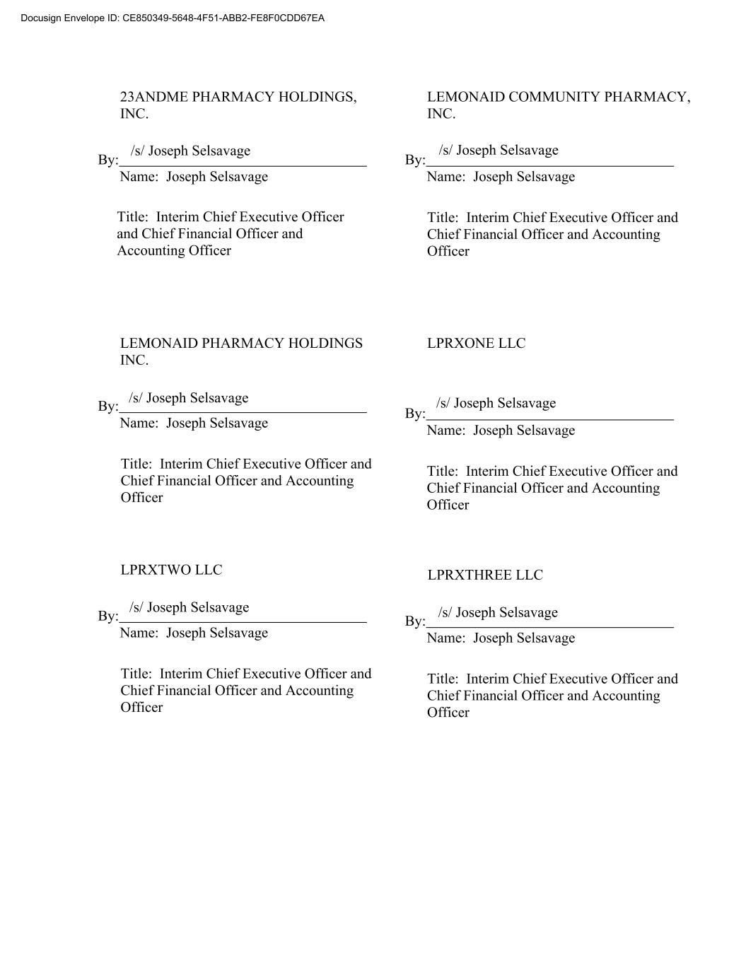 23ANDME PHARMACY HOLDINGS, INC. By: Name: Joseph Selsavage LEMONAID PHARMACY HOLDINGS INC. By: Title: Interim Chief Executive Officer and Chief Financial Officer and Accounting Officer By: Name: Joseph Selsavage Title: Interim Chief Executive Officer and Chief Financial Officer and Accounting Officer LEMONAID COMMUNITY PHARMACY, INC. By: Name: Joseph Selsavage Title: Interim Chief Executive Officer and Chief Financial Officer and Accounting Officer LPRXONE LLC By: Name: Joseph Selsavage Title: Interim Chief Executive Officer and Chief Financial Officer and Accounting Officer LPRXTHREE LLC By: Name: Joseph Selsavage Title: Interim Chief Executive Officer and Chief Financial Officer and Accounting Officer Docusign Envelope ID: CE850349-5648-4F51-ABB2-FE8F0CDD67EA /s/ Joseph Selsavage /s/ Joseph Selsavage /s/ Joseph Selsavage /s/ Joseph Selsavage /s/ Joseph Selsavage /s/ Joseph Selsavage Name: Joseph Selsavage Title: Interim Chief Executive Officer and Chief Financial Officer and Accounting Officer LPRXTWO LLC