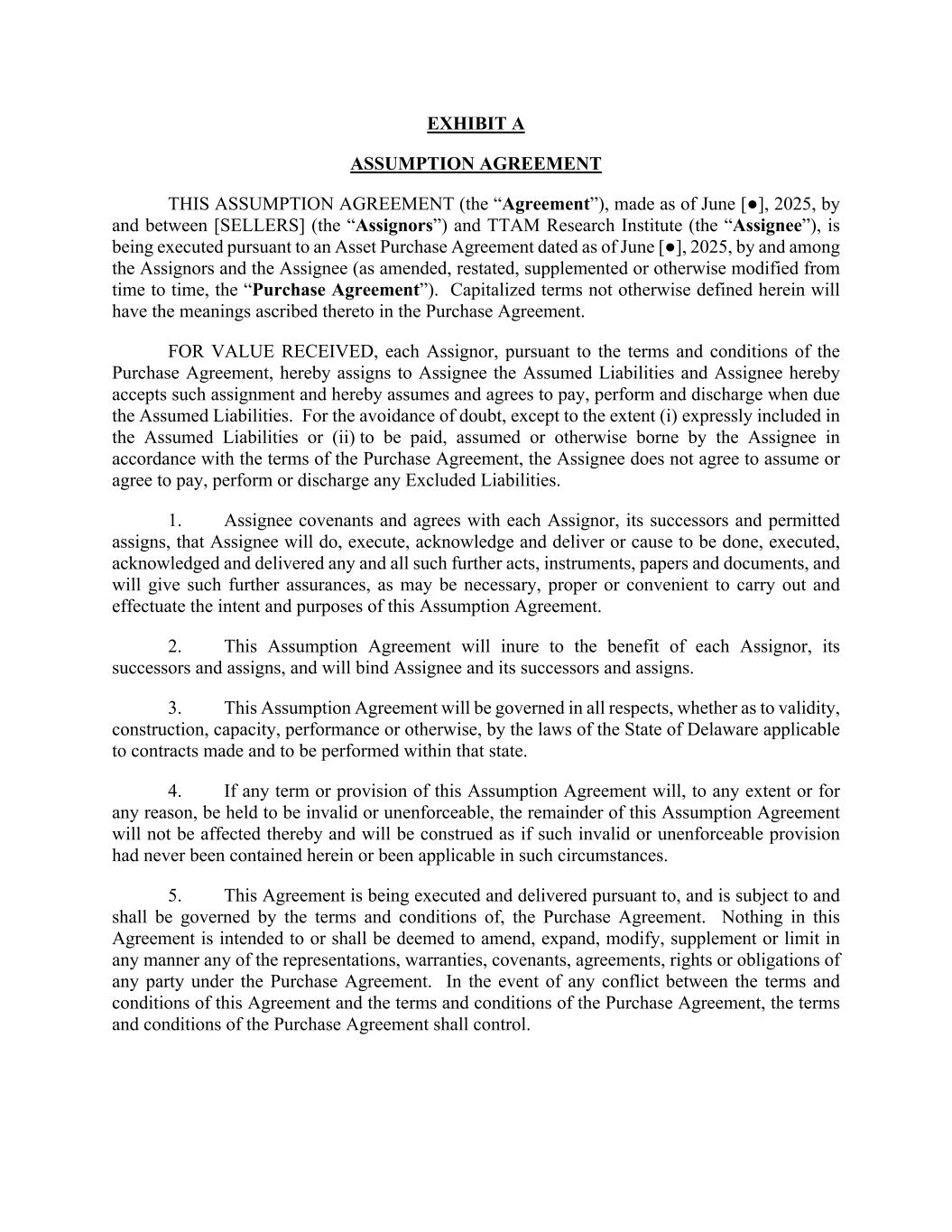 EXHIBIT A ASSUMPTION AGREEMENT THIS ASSUMPTION AGREEMENT (the “Agreement”), made as of June [●], 2025, by and between [SELLERS] (the “Assignors”) and TTAM Research Institute (the “Assignee”), is being executed pursuant to an Asset Purchase Agreement dated as of June [●], 2025, by and among the Assignors and the Assignee (as amended, restated, supplemented or otherwise modified from time to time, the “Purchase Agreement”). Capitalized terms not otherwise defined herein will have the meanings ascribed thereto in the Purchase Agreement. FOR VALUE RECEIVED, each Assignor, pursuant to the terms and conditions of the Purchase Agreement, hereby assigns to Assignee the Assumed Liabilities and Assignee hereby accepts such assignment and hereby assumes and agrees to pay, perform and discharge when due the Assumed Liabilities. For the avoidance of doubt, except to the extent (i) expressly included in the Assumed Liabilities or (ii) to be paid, assumed or otherwise borne by the Assignee in accordance with the terms of the Purchase Agreement, the Assignee does not agree to assume or agree to pay, perform or discharge any Excluded Liabilities. 1. Assignee covenants and agrees with each Assignor, its successors and permitted assigns, that Assignee will do, execute, acknowledge and deliver or cause to be done, executed, acknowledged and delivered any and all such further acts, instruments, papers and documents, and will give such further assurances, as may be necessary, proper or convenient to carry out and effectuate the intent and purposes of this Assumption Agreement. 2. This Assumption Agreement will inure to the benefit of each Assignor, its successors and assigns, and will bind Assignee and its successors and assigns. 3. This Assumption Agreement will be governed in all respects, whether as to validity, construction, capacity, performance or otherwise, by the laws of the State of Delaware applicable to contracts made and to be performed within that state. 4. If any term or provision of this Assumption Agreement will, to any extent or for any reason, be held to be invalid or unenforceable, the remainder of this Assumption Agreement will not be affected thereby and will be construed as if such invalid or unenforceable provision had never been contained herein or been applicable in such circumstances. 5. This Agreement is being executed and delivered pursuant to, and is subject to and shall be governed by the terms and conditions of, the Purchase Agreement. Nothing in this Agreement is intended to or shall be deemed to amend, expand, modify, supplement or limit in any manner any of the representations, warranties, covenants, agreements, rights or obligations of any party under the Purchase Agreement. In the event of any conflict between the terms and conditions of this Agreement and the terms and conditions of the Purchase Agreement, the terms and conditions of the Purchase Agreement shall control.