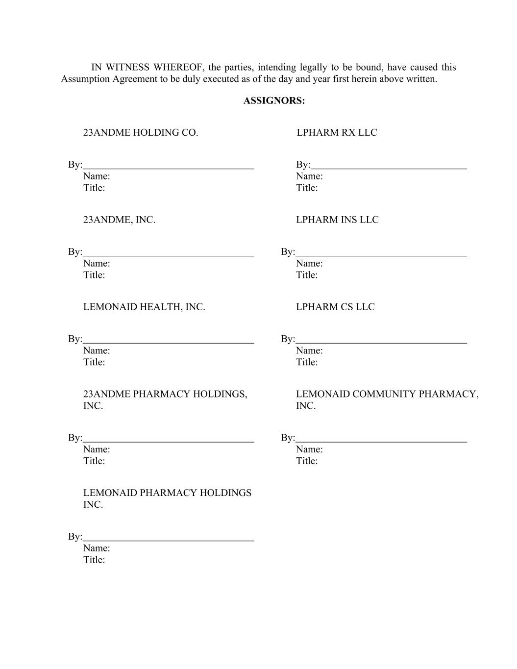 IN WITNESS WHEREOF, the parties, intending legally to be bound, have caused this Assumption Agreement to be duly executed as of the day and year first herein above written. ASSIGNORS: 23ANDME HOLDING CO. By: Name: Title: 23ANDME, INC. By: Name: Title: LEMONAID HEALTH, INC. By: Name: Title: 23ANDME PHARMACY HOLDINGS, INC. By: Name: Title: LEMONAID PHARMACY HOLDINGS INC. By: Name: Title: LPHARM RX LLC By: Name: Title: LPHARM INS LLC By: Name: Title: LPHARM CS LLC By: Name: Title: LEMONAID COMMUNITY PHARMACY, INC. By: Name: Title: