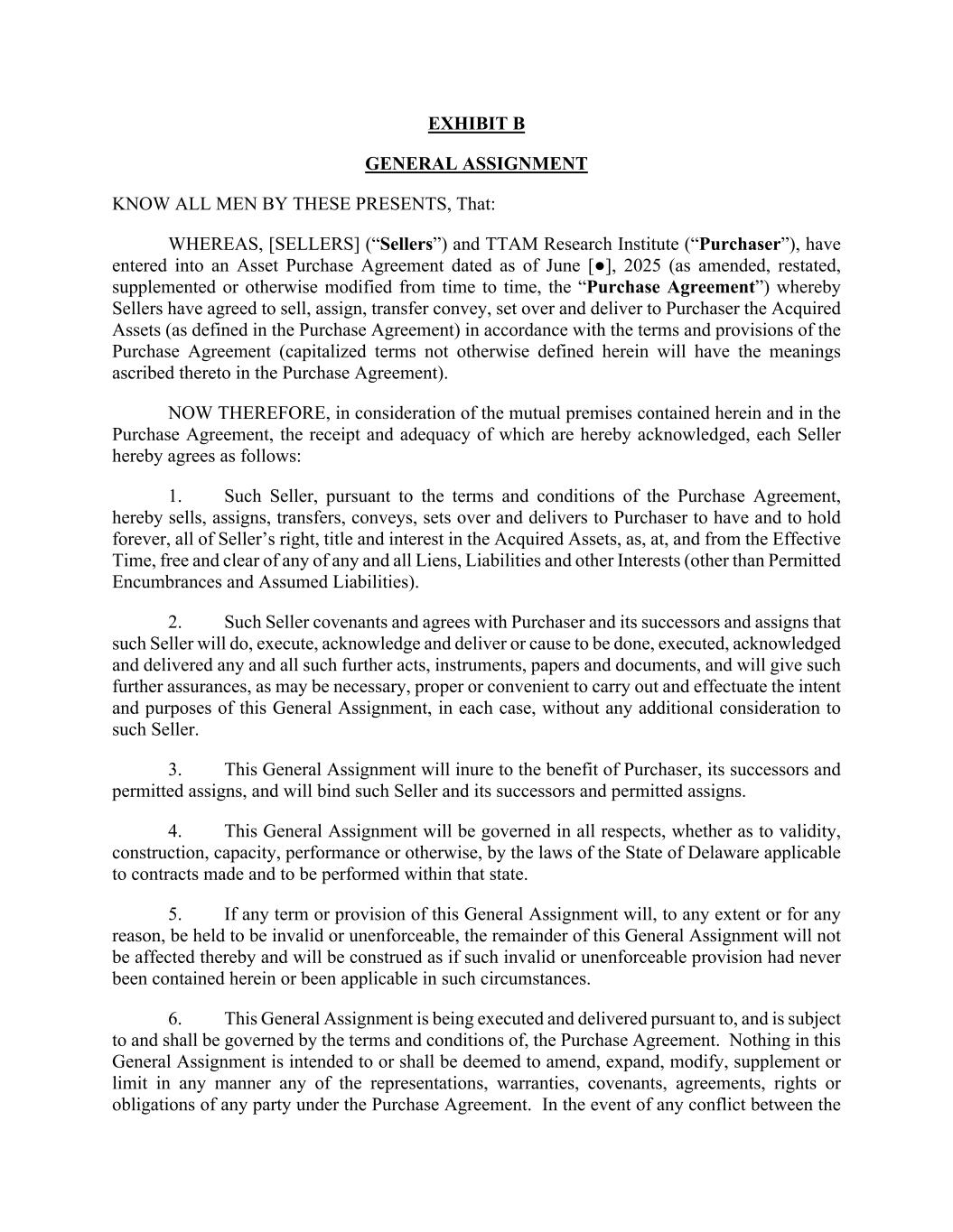 EXHIBIT B GENERAL ASSIGNMENT KNOW ALL MEN BY THESE PRESENTS, That: WHEREAS, [SELLERS] (“Sellers”) and TTAM Research Institute (“Purchaser”), have entered into an Asset Purchase Agreement dated as of June [●], 2025 (as amended, restated, supplemented or otherwise modified from time to time, the “Purchase Agreement”) whereby Sellers have agreed to sell, assign, transfer convey, set over and deliver to Purchaser the Acquired Assets (as defined in the Purchase Agreement) in accordance with the terms and provisions of the Purchase Agreement (capitalized terms not otherwise defined herein will have the meanings ascribed thereto in the Purchase Agreement). NOW THEREFORE, in consideration of the mutual premises contained herein and in the Purchase Agreement, the receipt and adequacy of which are hereby acknowledged, each Seller hereby agrees as follows: 1. Such Seller, pursuant to the terms and conditions of the Purchase Agreement, hereby sells, assigns, transfers, conveys, sets over and delivers to Purchaser to have and to hold forever, all of Seller’s right, title and interest in the Acquired Assets, as, at, and from the Effective Time, free and clear of any of any and all Liens, Liabilities and other Interests (other than Permitted Encumbrances and Assumed Liabilities). 2. Such Seller covenants and agrees with Purchaser and its successors and assigns that such Seller will do, execute, acknowledge and deliver or cause to be done, executed, acknowledged and delivered any and all such further acts, instruments, papers and documents, and will give such further assurances, as may be necessary, proper or convenient to carry out and effectuate the intent and purposes of this General Assignment, in each case, without any additional consideration to such Seller. 3. This General Assignment will inure to the benefit of Purchaser, its successors and permitted assigns, and will bind such Seller and its successors and permitted assigns. 4. This General Assignment will be governed in all respects, whether as to validity, construction, capacity, performance or otherwise, by the laws of the State of Delaware applicable to contracts made and to be performed within that state. 5. If any term or provision of this General Assignment will, to any extent or for any reason, be held to be invalid or unenforceable, the remainder of this General Assignment will not be affected thereby and will be construed as if such invalid or unenforceable provision had never been contained herein or been applicable in such circumstances. 6. This General Assignment is being executed and delivered pursuant to, and is subject to and shall be governed by the terms and conditions of, the Purchase Agreement. Nothing in this General Assignment is intended to or shall be deemed to amend, expand, modify, supplement or limit in any manner any of the representations, warranties, covenants, agreements, rights or obligations of any party under the Purchase Agreement. In the event of any conflict between the