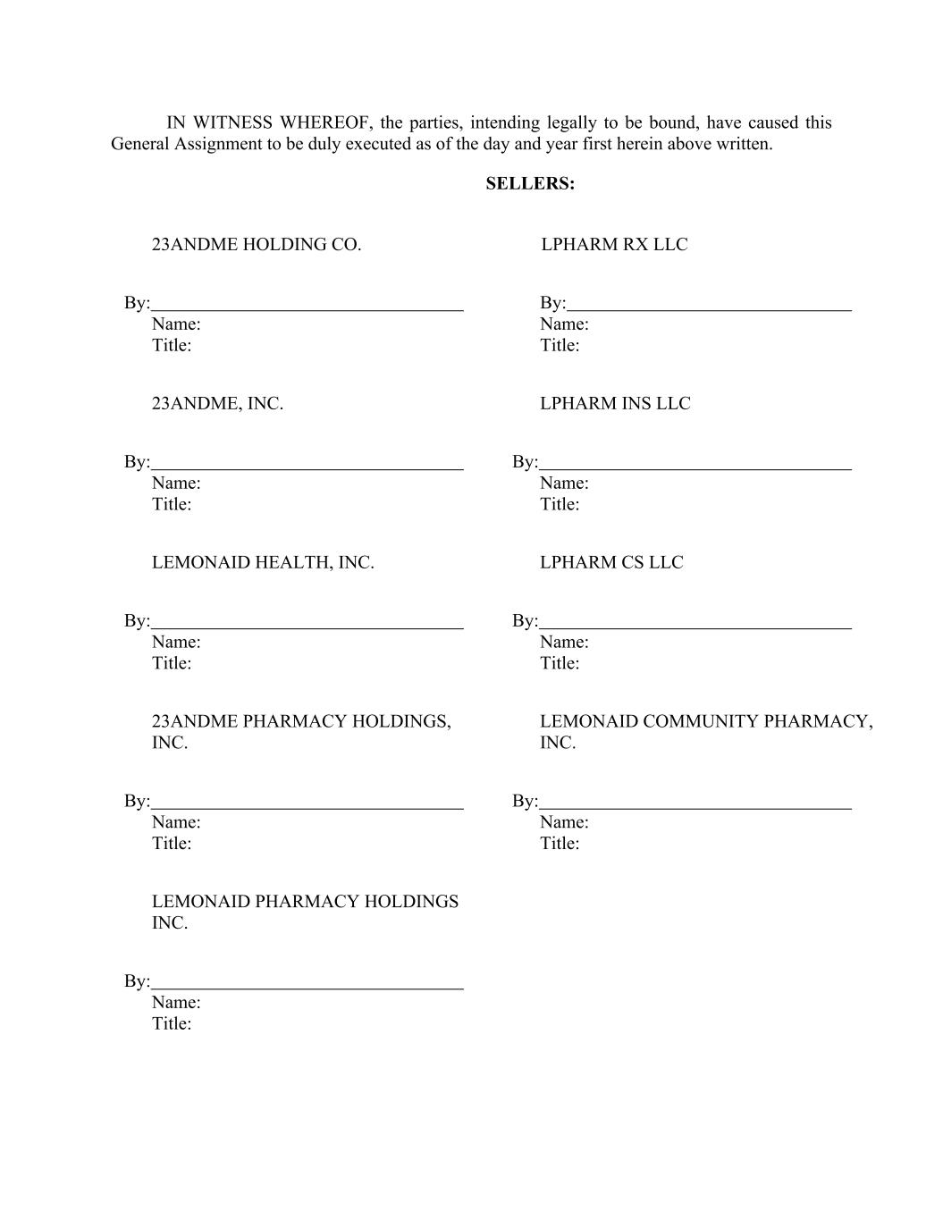 IN WITNESS WHEREOF, the parties, intending legally to be bound, have caused this General Assignment to be duly executed as of the day and year first herein above written. SELLERS: 23ANDME HOLDING CO. By: Name: Title: 23ANDME, INC. By: Name: Title: LEMONAID HEALTH, INC. By: Name: Title: 23ANDME PHARMACY HOLDINGS, INC. By: Name: Title: LEMONAID PHARMACY HOLDINGS INC. By: Name: Title: LPHARM RX LLC By: Name: Title: LPHARM INS LLC By: Name: Title: LPHARM CS LLC By: Name: Title: LEMONAID COMMUNITY PHARMACY, INC. By: Name: Title:
