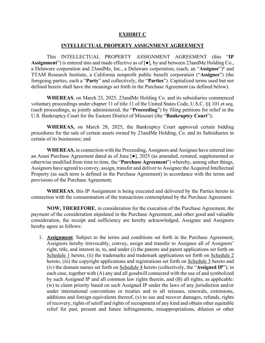 EXHIBIT C INTELLECTUAL PROPERTY ASSIGNMENT AGREEMENT This INTELLECTUAL PROPERTY ASSIGNMENT AGREEMENT (this “IP Assignment”) is entered into and made effective as of [●], by and between 23andMe Holding Co., a Delaware corporation and 23andMe, Inc., a Delaware corporation, (each, an “Assignor”)6 and TTAM Research Institute, a California nonprofit public benefit corporation (“Assignee”) (the foregoing parties, each a “Party” and collectively, the “Parties”). Capitalized terms used but not defined herein shall have the meanings set forth in the Purchase Agreement (as defined below). WHEREAS, on March 23, 2025, 23andMe Holding Co. and its subsidiaries commenced voluntary proceedings under chapter 11 of title 11 of the United States Code, U.S.C. §§ 101 et seq. (such proceedings, as jointly administered, the “Proceeding”) by filing petitions for relief in the U.S. Bankruptcy Court for the Eastern District of Missouri (the “Bankruptcy Court”); WHEREAS, on March 28, 2025, the Bankruptcy Court approved certain bidding procedures for the sale of certain assets owned by 23andMe Holding, Co. and its Subsidiaries in certain of its businesses; and WHEREAS, in connection with the Proceeding, Assignors and Assignee have entered into an Asset Purchase Agreement dated as of June [●], 2025 (as amended, restated, supplemented or otherwise modified from time to time, the “Purchase Agreement”) whereby, among other things, Assignors have agreed to convey, assign, transfer and deliver to Assignee the Acquired Intellectual Property (as such term is defined in the Purchase Agreement) in accordance with the terms and provisions of the Purchase Agreement; WHEREAS, this IP Assignment is being executed and delivered by the Parties hereto in connection with the consummation of the transactions contemplated by the Purchase Agreement. NOW, THEREFORE, in consideration for the execution of the Purchase Agreement, the payment of the consideration stipulated in the Purchase Agreement, and other good and valuable consideration, the receipt and sufficiency are hereby acknowledged, Assignee and Assignors hereby agree as follows: 1. Assignment. Subject to the terms and conditions set forth in the Purchase Agreement, Assignors hereby irrevocably, convey, assign and transfer to Assignee all of Assignors’ right, title, and interest in, to, and under (i) the patents and patent applications set forth on Schedule 1 hereto, (ii) the trademarks and trademark applications set forth on Schedule 2 hereto, (iii) the copyright applications and registrations set forth on Schedule 3 hereto and (iv) the domain names set forth on Schedule 4 hereto (collectively, the “Assigned IP”); in each case, together with (A) any and all goodwill connected with the use of and symbolized by such Assigned IP and all common law rights therein, and (B) all rights, as applicable: (w) to claim priority based on such Assigned IP under the laws of any jurisdiction and/or under international conventions or treaties and to all reissues, renewals, extensions, additions and foreign equivalents thereof, (x) to sue and recover damages, refunds, rights of recovery, rights of setoff and rights of recoupment of any kind and obtain other equitable relief for past, present and future infringements, misappropriations, dilution or other