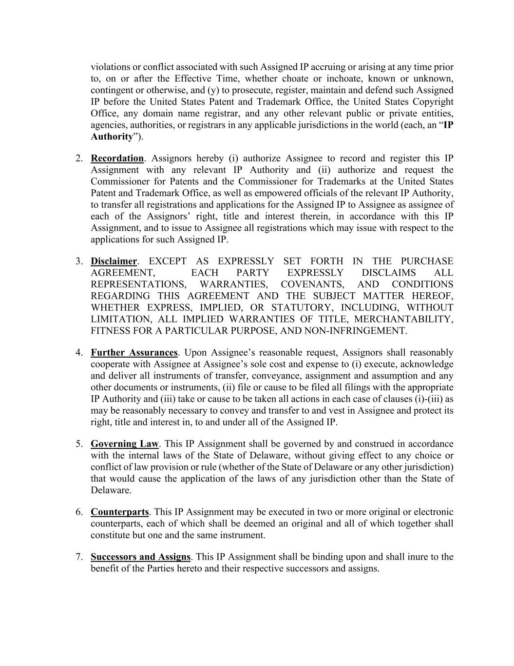 violations or conflict associated with such Assigned IP accruing or arising at any time prior to, on or after the Effective Time, whether choate or inchoate, known or unknown, contingent or otherwise, and (y) to prosecute, register, maintain and defend such Assigned IP before the United States Patent and Trademark Office, the United States Copyright Office, any domain name registrar, and any other relevant public or private entities, agencies, authorities, or registrars in any applicable jurisdictions in the world (each, an “IP Authority”). 2. Recordation. Assignors hereby (i) authorize Assignee to record and register this IP Assignment with any relevant IP Authority and (ii) authorize and request the Commissioner for Patents and the Commissioner for Trademarks at the United States Patent and Trademark Office, as well as empowered officials of the relevant IP Authority, to transfer all registrations and applications for the Assigned IP to Assignee as assignee of each of the Assignors’ right, title and interest therein, in accordance with this IP Assignment, and to issue to Assignee all registrations which may issue with respect to the applications for such Assigned IP. 3. Disclaimer. EXCEPT AS EXPRESSLY SET FORTH IN THE PURCHASE AGREEMENT, EACH PARTY EXPRESSLY DISCLAIMS ALL REPRESENTATIONS, WARRANTIES, COVENANTS, AND CONDITIONS REGARDING THIS AGREEMENT AND THE SUBJECT MATTER HEREOF, WHETHER EXPRESS, IMPLIED, OR STATUTORY, INCLUDING, WITHOUT LIMITATION, ALL IMPLIED WARRANTIES OF TITLE, MERCHANTABILITY, FITNESS FOR A PARTICULAR PURPOSE, AND NON-INFRINGEMENT. 4. Further Assurances. Upon Assignee’s reasonable request, Assignors shall reasonably cooperate with Assignee at Assignee’s sole cost and expense to (i) execute, acknowledge and deliver all instruments of transfer, conveyance, assignment and assumption and any other documents or instruments, (ii) file or cause to be filed all filings with the appropriate IP Authority and (iii) take or cause to be taken all actions in each case of clauses (i)-(iii) as may be reasonably necessary to convey and transfer to and vest in Assignee and protect its right, title and interest in, to and under all of the Assigned IP. 5. Governing Law. This IP Assignment shall be governed by and construed in accordance with the internal laws of the State of Delaware, without giving effect to any choice or conflict of law provision or rule (whether of the State of Delaware or any other jurisdiction) that would cause the application of the laws of any jurisdiction other than the State of Delaware. 6. Counterparts. This IP Assignment may be executed in two or more original or electronic counterparts, each of which shall be deemed an original and all of which together shall constitute but one and the same instrument. 7. Successors and Assigns. This IP Assignment shall be binding upon and shall inure to the benefit of the Parties hereto and their respective successors and assigns.
