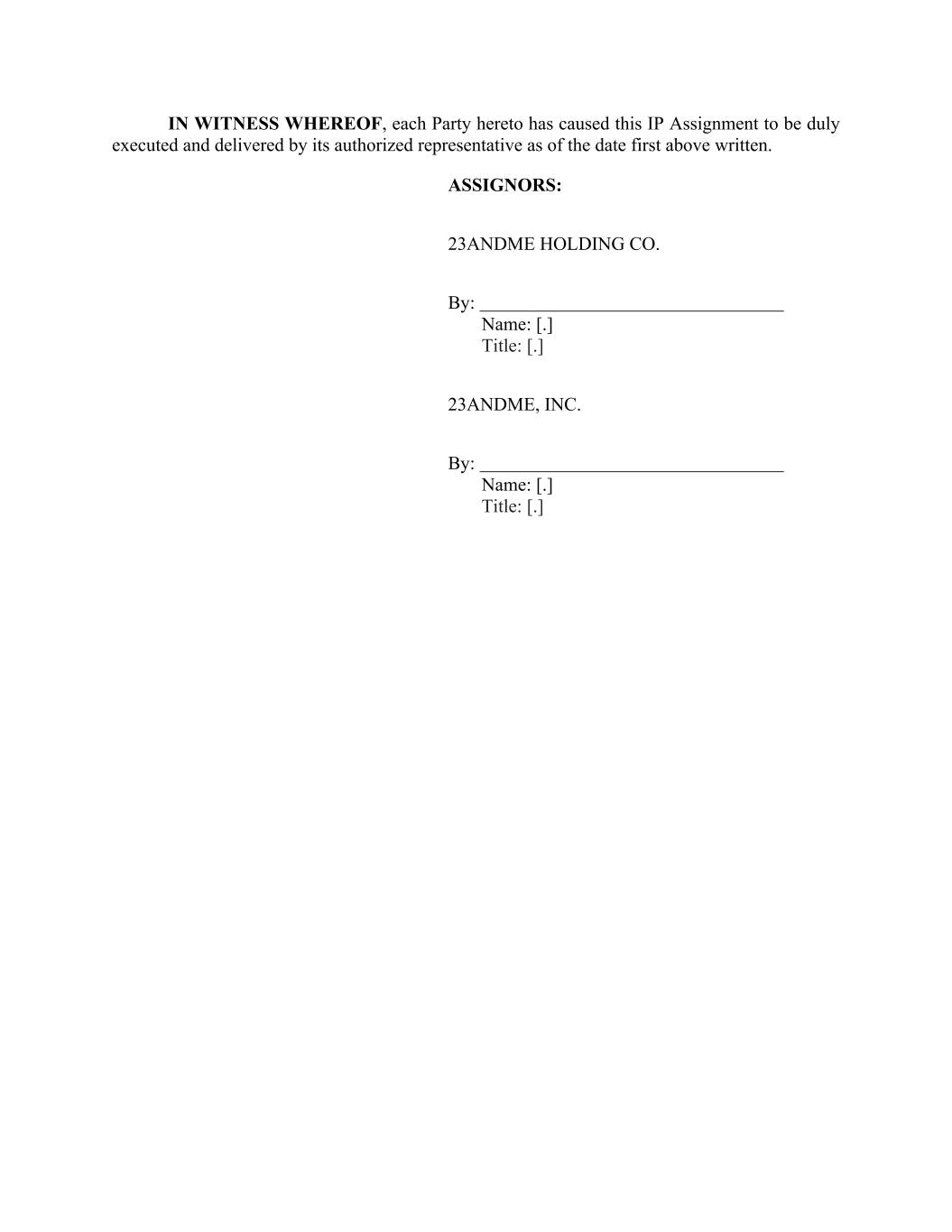 IN WITNESS WHEREOF, each Party hereto has caused this IP Assignment to be duly executed and delivered by its authorized representative as of the date first above written. ASSIGNORS: 23ANDME HOLDING CO. By: Name: [.] Title: [.] 23ANDME, INC. By: Name: [.] Title: [.]