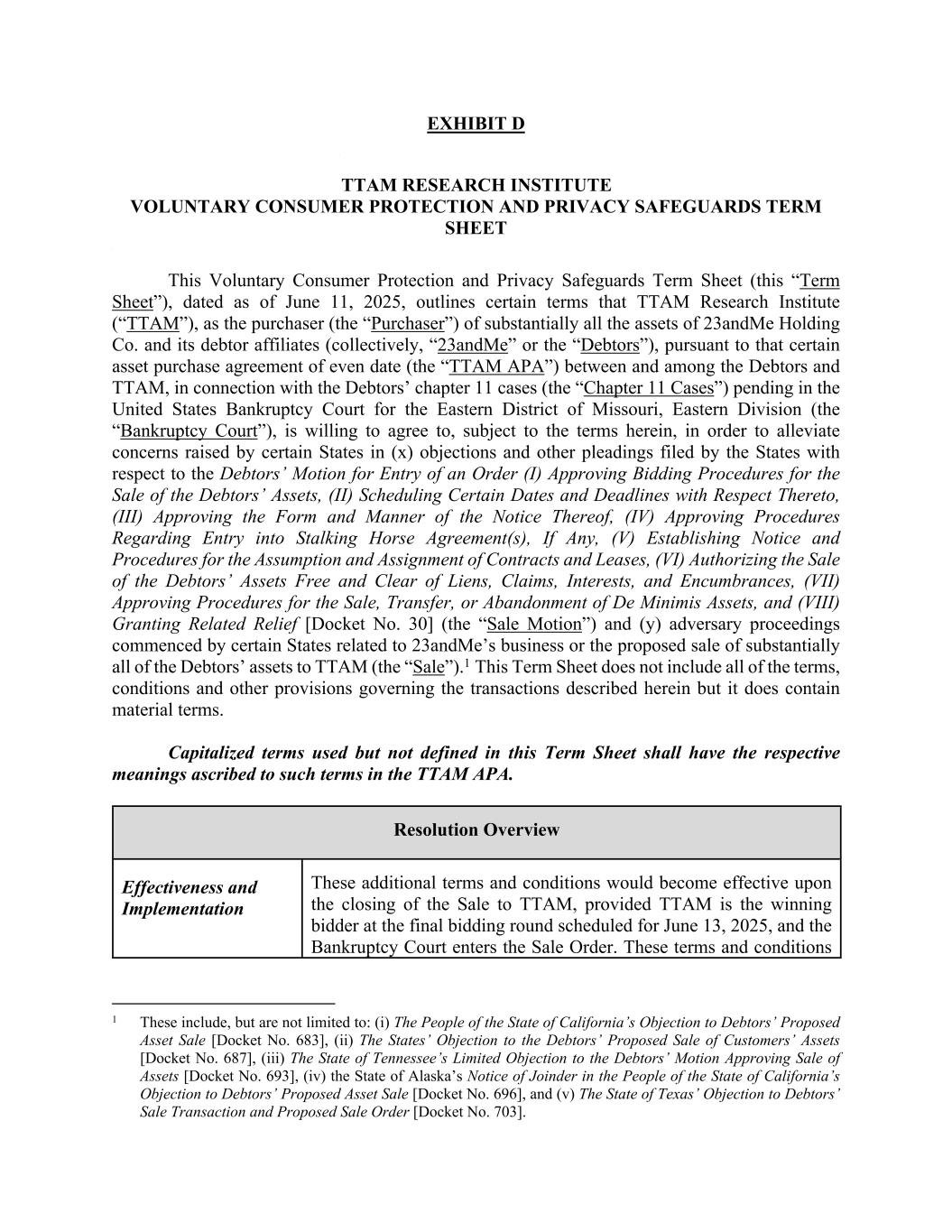EXHIBIT D TTAM RESEARCH INSTITUTE VOLUNTARY CONSUMER PROTECTION AND PRIVACY SAFEGUARDS TERM SHEET This Voluntary Consumer Protection and Privacy Safeguards Term Sheet (this “Term Sheet”), dated as of June 11, 2025, outlines certain terms that TTAM Research Institute (“TTAM”), as the purchaser (the “Purchaser”) of substantially all the assets of 23andMe Holding Co. and its debtor affiliates (collectively, “23andMe” or the “Debtors”), pursuant to that certain asset purchase agreement of even date (the “TTAM APA”) between and among the Debtors and TTAM, in connection with the Debtors’ chapter 11 cases (the “Chapter 11 Cases”) pending in the United States Bankruptcy Court for the Eastern District of Missouri, Eastern Division (the “Bankruptcy Court”), is willing to agree to, subject to the terms herein, in order to alleviate concerns raised by certain States in (x) objections and other pleadings filed by the States with respect to the Debtors’ Motion for Entry of an Order (I) Approving Bidding Procedures for the Sale of the Debtors’ Assets, (II) Scheduling Certain Dates and Deadlines with Respect Thereto, (III) Approving the Form and Manner of the Notice Thereof, (IV) Approving Procedures Regarding Entry into Stalking Horse Agreement(s), If Any, (V) Establishing Notice and Procedures for the Assumption and Assignment of Contracts and Leases, (VI) Authorizing the Sale of the Debtors’ Assets Free and Clear of Liens, Claims, Interests, and Encumbrances, (VII) Approving Procedures for the Sale, Transfer, or Abandonment of De Minimis Assets, and (VIII) Granting Related Relief [Docket No. 30] (the “Sale Motion”) and (y) adversary proceedings commenced by certain States related to 23andMe’s business or the proposed sale of substantially all of the Debtors’ assets to TTAM (the “Sale”).1 This Term Sheet does not include all of the terms, conditions and other provisions governing the transactions described herein but it does contain material terms. Capitalized terms used but not defined in this Term Sheet shall have the respective meanings ascribed to such terms in the TTAM APA. Resolution Overview Effectiveness and Implementation These additional terms and conditions would become effective upon the closing of the Sale to TTAM, provided TTAM is the winning bidder at the final bidding round scheduled for June 13, 2025, and the Bankruptcy Court enters the Sale Order. These terms and conditions 1 These include, but are not limited to: (i) The People of the State of California’s Objection to Debtors’ Proposed Asset Sale [Docket No. 683], (ii) The States’ Objection to the Debtors’ Proposed Sale of Customers’ Assets [Docket No. 687], (iii) The State of Tennessee’s Limited Objection to the Debtors’ Motion Approving Sale of Assets [Docket No. 693], (iv) the State of Alaska’s Notice of Joinder in the People of the State of California’s Objection to Debtors’ Proposed Asset Sale [Docket No. 696], and (v) The State of Texas’ Objection to Debtors’ Sale Transaction and Proposed Sale Order [Docket No. 703].