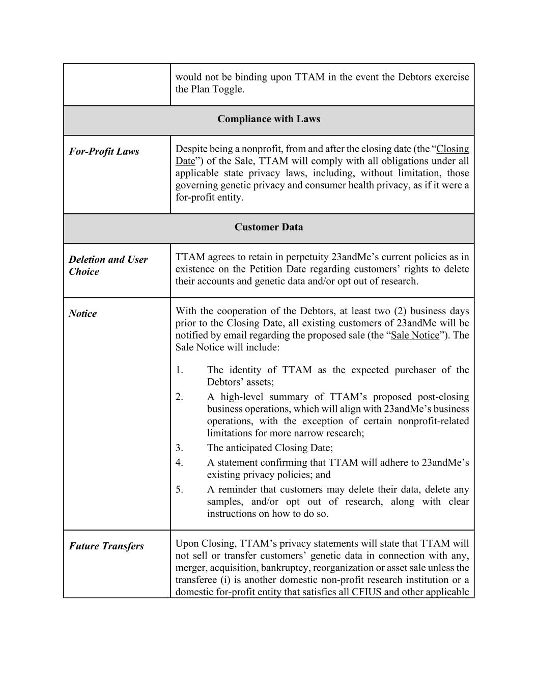 would not be binding upon TTAM in the event the Debtors exercise the Plan Toggle. Compliance with Laws For-Profit Laws Despite being a nonprofit, from and after the closing date (the “Closing Date”) of the Sale, TTAM will comply with all obligations under all applicable state privacy laws, including, without limitation, those governing genetic privacy and consumer health privacy, as if it were a for-profit entity. Customer Data Deletion and User Choice TTAM agrees to retain in perpetuity 23andMe’s current policies as in existence on the Petition Date regarding customers’ rights to delete their accounts and genetic data and/or opt out of research. Notice With the cooperation of the Debtors, at least two (2) business days prior to the Closing Date, all existing customers of 23andMe will be notified by email regarding the proposed sale (the “Sale Notice”). The Sale Notice will include: 1. The identity of TTAM as the expected purchaser of the Debtors’ assets; 2. A high-level summary of TTAM’s proposed post-closing business operations, which will align with 23andMe’s business operations, with the exception of certain nonprofit-related limitations for more narrow research; 3. The anticipated Closing Date; 4. A statement confirming that TTAM will adhere to 23andMe’s existing privacy policies; and 5. A reminder that customers may delete their data, delete any samples, and/or opt out of research, along with clear instructions on how to do so. Future Transfers Upon Closing, TTAM’s privacy statements will state that TTAM will not sell or transfer customers’ genetic data in connection with any, merger, acquisition, bankruptcy, reorganization or asset sale unless the transferee (i) is another domestic non-profit research institution or a domestic for-profit entity that satisfies all CFIUS and other applicable