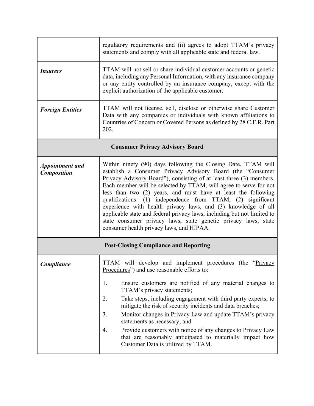regulatory requirements and (ii) agrees to adopt TTAM’s privacy statements and comply with all applicable state and federal law. Insurers TTAM will not sell or share individual customer accounts or genetic data, including any Personal Information, with any insurance company or any entity controlled by an insurance company, except with the explicit authorization of the applicable customer. Foreign Entities TTAM will not license, sell, disclose or otherwise share Customer Data with any companies or individuals with known affiliations to Countries of Concern or Covered Persons as defined by 28 C.F.R. Part 202. Consumer Privacy Advisory Board Appointment and Composition Within ninety (90) days following the Closing Date, TTAM will establish a Consumer Privacy Advisory Board (the “Consumer Privacy Advisory Board”), consisting of at least three (3) members. Each member will be selected by TTAM, will agree to serve for not less than two (2) years, and must have at least the following qualifications: (1) independence from TTAM, (2) significant experience with health privacy laws, and (3) knowledge of all applicable state and federal privacy laws, including but not limited to state consumer privacy laws, state genetic privacy laws, state consumer health privacy laws, and HIPAA. Post-Closing Compliance and Reporting Compliance TTAM will develop and implement procedures (the “Privacy Procedures”) and use reasonable efforts to: 1. Ensure customers are notified of any material changes to TTAM’s privacy statements; 2. Take steps, including engagement with third party experts, to mitigate the risk of security incidents and data breaches; 3. Monitor changes in Privacy Law and update TTAM’s privacy statements as necessary; and 4. Provide customers with notice of any changes to Privacy Law that are reasonably anticipated to materially impact how Customer Data is utilized by TTAM.