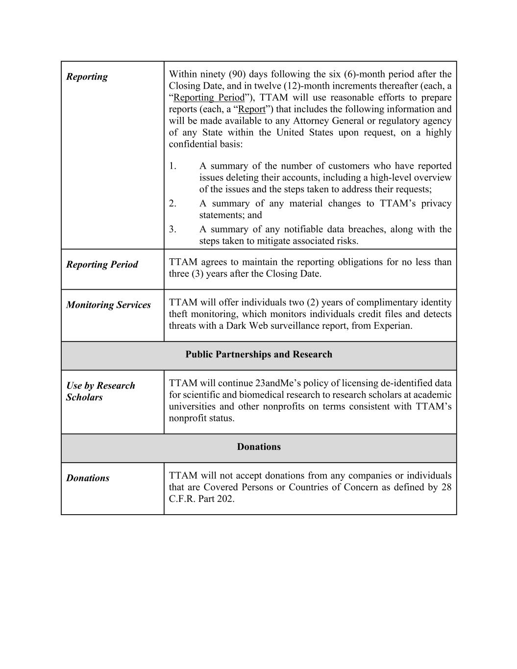 Reporting Within ninety (90) days following the six (6)-month period after the Closing Date, and in twelve (12)-month increments thereafter (each, a “Reporting Period”), TTAM will use reasonable efforts to prepare reports (each, a “Report”) that includes the following information and will be made available to any Attorney General or regulatory agency of any State within the United States upon request, on a highly confidential basis: 1. A summary of the number of customers who have reported issues deleting their accounts, including a high-level overview of the issues and the steps taken to address their requests; 2. A summary of any material changes to TTAM’s privacy statements; and 3. A summary of any notifiable data breaches, along with the steps taken to mitigate associated risks. Reporting Period TTAM agrees to maintain the reporting obligations for no less than three (3) years after the Closing Date. Monitoring Services TTAM will offer individuals two (2) years of complimentary identity theft monitoring, which monitors individuals credit files and detects threats with a Dark Web surveillance report, from Experian. Public Partnerships and Research Use by Research Scholars TTAM will continue 23andMe’s policy of licensing de-identified data for scientific and biomedical research to research scholars at academic universities and other nonprofits on terms consistent with TTAM’s nonprofit status. Donations Donations TTAM will not accept donations from any companies or individuals that are Covered Persons or Countries of Concern as defined by 28 C.F.R. Part 202.
