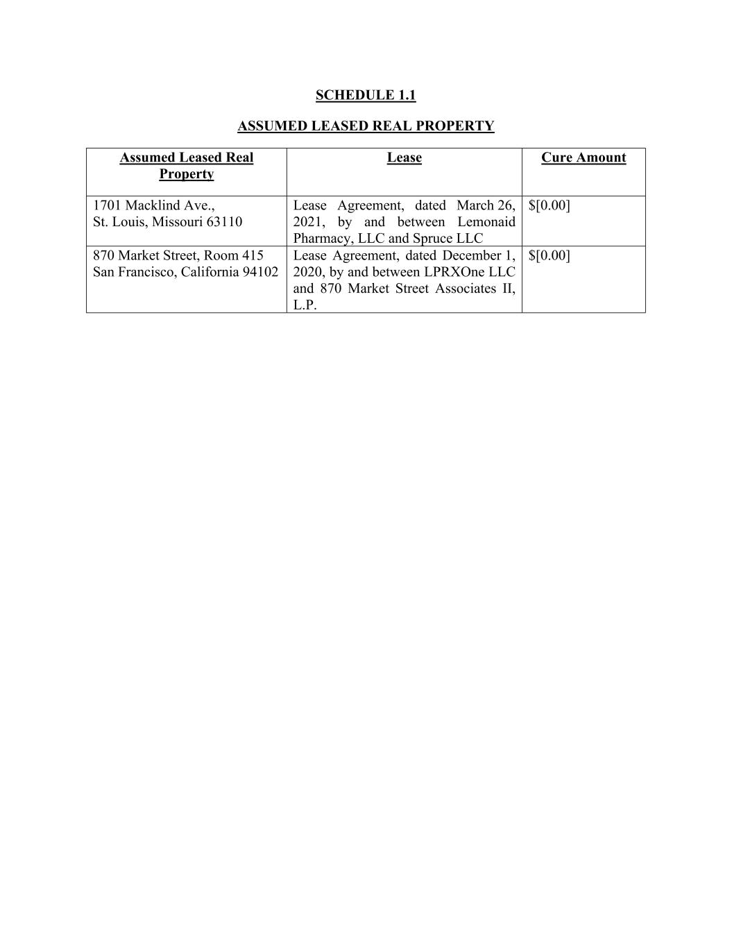 SCHEDULE 1.1 ASSUMED LEASED REAL PROPERTY Assumed Leased Real Property Lease Cure Amount 1701 Macklind Ave., St. Louis, Missouri 63110 Lease Agreement, dated March 26, 2021, by and between Lemonaid Pharmacy, LLC and Spruce LLC $[0.00] 870 Market Street, Room 415 San Francisco, California 94102 Lease Agreement, dated December 1, 2020, by and between LPRXOne LLC and 870 Market Street Associates II, L.P. $[0.00]