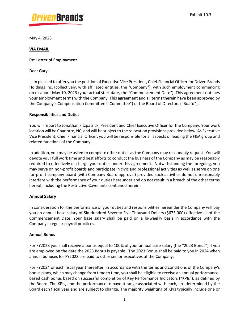 1 May 4, 2023 VIA EMAIL Re: Letter of Employment Dear Gary: I am pleased to offer you the position of Executive Vice President, Chief Financial Officer for Driven Brands Holdings Inc. (collectively, with affiliated entities, the "Company"), with such employment commencing on or about May 10, 2023 (your actual start date, the "Commencement Date"). This agreement outlines your employment terms with the Company. This agreement and all terms therein have been approved by the Company’s Compensation Committee (“Committee”) of the Board of Directors (“Board”). Responsibilities and Duties You will report to Jonathan Fitzpatrick, President and Chief Executive Officer for the Company. Your work location will be Charlotte, NC, and will be subject to the relocation provisions provided below. As Executive Vice President, Chief Financial Officer, you will be responsible for all aspects of leading the F&A group and related functions of the Company. In addition, you may be asked to complete other duties as the Company may reasonably request. You will devote your full work time and best efforts to conduct the business of the Company as may be reasonably required to effectively discharge your duties under this agreement. Notwithstanding the foregoing, you may serve on non-profit boards and participate in civic and professional activities as well as serve on one for-profit company board (with Company Board approval) provided such activities do not unreasonably interfere with the performance of your duties hereunder and do not result in a breach of the other terms hereof, including the Restrictive Covenants contained herein. Annual Salary In consideration for the performance of your duties and responsibilities hereunder the Company will pay you an annual base salary of Six Hundred Seventy Five Thousand Dollars ($675,000) effective as of the Commencement Date. Your base salary shall be paid on a bi-weekly basis in accordance with the Company's regular payroll practices. Annual Bonus For FY2023 you shall receive a bonus equal to 100% of your annual base salary (the “2023 Bonus”) if you are employed on the date the 2023 Bonus is payable. The 2023 Bonus shall be paid to you in 2024 when annual bonuses for FY2023 are paid to other senior executives of the Company. For FY2024 or each fiscal year thereafter, in accordance with the terms and conditions of the Company's bonus plans, which may change from time to time, you shall be eligible to receive an annual performance- based cash bonus based on successful completion of Key Performance Indicators (“KPIs”), as defined by the Board. The KPIs, and the performance to payout range associated with each, are determined by the Board each fiscal year and are subject to change. The majority weighting of KPIs typically include one or Exhibit 10.3