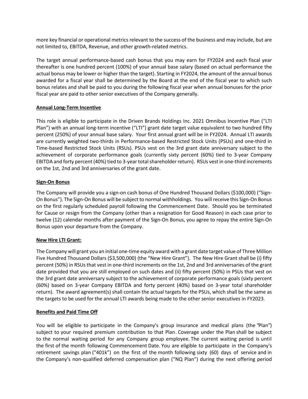 more key financial or operational metrics relevant to the success of the business and may include, but are not limited to, EBITDA, Revenue, and other growth-related metrics. The target annual performance-based cash bonus that you may earn for FY2024 and each fiscal year thereafter is one hundred percent (100%) of your annual base salary (based on actual performance the actual bonus may be lower or higher than the target). Starting in FY2024, the amount of the annual bonus awarded for a fiscal year shall be determined by the Board at the end of the fiscal year to which such bonus relates and shall be paid to you during the following fiscal year when annual bonuses for the prior fiscal year are paid to other senior executives of the Company generally. Annual Long-Term Incentive This role is eligible to participate in the Driven Brands Holdings Inc. 2021 Omnibus Incentive Plan (“LTI Plan”) with an annual long-term incentive (“LTI”) grant date target value equivalent to two hundred fifty percent (250%) of your annual base salary. Your first annual grant will be in FY2024. Annual LTI awards are currently weighted two-thirds in Performance-based Restricted Stock Units (PSUs) and one-third in Time-based Restricted Stock Units (RSUs). PSUs vest on the 3rd grant date anniversary subject to the achievement of corporate performance goals (currently sixty percent (60%) tied to 3-year Company EBITDA and forty percent (40%) tied to 3-year total shareholder return). RSUs vest in one-third increments on the 1st, 2nd and 3rd anniversaries of the grant date. Sign-On Bonus The Company will provide you a sign-on cash bonus of One Hundred Thousand Dollars ($100,000) (“Sign- On Bonus”). The Sign-On Bonus will be subject to normal withholdings. You will receive this Sign-On Bonus on the first regularly scheduled payroll following the Commencement Date. Should you be terminated for Cause or resign from the Company (other than a resignation for Good Reason) in each case prior to twelve (12) calendar months after payment of the Sign-On Bonus, you agree to repay the entire Sign-On Bonus upon your departure from the Company. New Hire LTI Grant: The Company will grant you an initial one-time equity award with a grant date target value of Three Million Five Hundred Thousand Dollars ($3,500,000) (the “New Hire Grant”). The New Hire Grant shall be (i) fifty percent (50%) in RSUs that vest in one-third increments on the 1st, 2nd and 3rd anniversaries of the grant date provided that you are still employed on such dates and (ii) fifty percent (50%) in PSUs that vest on the 3rd grant date anniversary subject to the achievement of corporate performance goals (sixty percent (60%) based on 3-year Company EBITDA and forty percent (40%) based on 3-year total shareholder return). The award agreement(s) shall contain the actual targets for the PSUs, which shall be the same as the targets to be used for the annual LTI awards being made to the other senior executives in FY2023. Benefits and Paid Time Off You will be eligible to participate in the Company's group insurance and medical plans (the "Plan") subject to your required premium contribution to that Plan. Coverage under the Plan shall be subject to the normal waiting period for any Company group employee. The current waiting period is until the first of the month following Commencement Date. You are eligible to participate in the Company's retirement savings plan (“401k”) on the first of the month following sixty (60) days of service and in the Company’s non-qualified deferred compensation plan (“NQ Plan”) during the next offering period