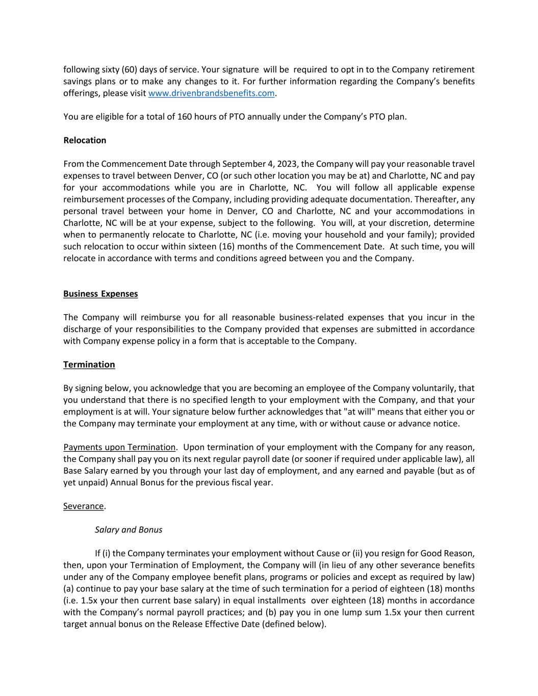 following sixty (60) days of service. Your signature will be required to opt in to the Company retirement savings plans or to make any changes to it. For further information regarding the Company’s benefits offerings, please visit www.drivenbrandsbenefits.com. You are eligible for a total of 160 hours of PTO annually under the Company’s PTO plan. Relocation From the Commencement Date through September 4, 2023, the Company will pay your reasonable travel expenses to travel between Denver, CO (or such other location you may be at) and Charlotte, NC and pay for your accommodations while you are in Charlotte, NC. You will follow all applicable expense reimbursement processes of the Company, including providing adequate documentation. Thereafter, any personal travel between your home in Denver, CO and Charlotte, NC and your accommodations in Charlotte, NC will be at your expense, subject to the following. You will, at your discretion, determine when to permanently relocate to Charlotte, NC (i.e. moving your household and your family); provided such relocation to occur within sixteen (16) months of the Commencement Date. At such time, you will relocate in accordance with terms and conditions agreed between you and the Company. Business Expenses The Company will reimburse you for all reasonable business-related expenses that you incur in the discharge of your responsibilities to the Company provided that expenses are submitted in accordance with Company expense policy in a form that is acceptable to the Company. Termination By signing below, you acknowledge that you are becoming an employee of the Company voluntarily, that you understand that there is no specified length to your employment with the Company, and that your employment is at will. Your signature below further acknowledges that "at will" means that either you or the Company may terminate your employment at any time, with or without cause or advance notice. Payments upon Termination. Upon termination of your employment with the Company for any reason, the Company shall pay you on its next regular payroll date (or sooner if required under applicable law), all Base Salary earned by you through your last day of employment, and any earned and payable (but as of yet unpaid) Annual Bonus for the previous fiscal year. Severance. Salary and Bonus If (i) the Company terminates your employment without Cause or (ii) you resign for Good Reason, then, upon your Termination of Employment, the Company will (in lieu of any other severance benefits under any of the Company employee benefit plans, programs or policies and except as required by law) (a) continue to pay your base salary at the time of such termination for a period of eighteen (18) months (i.e. 1.5x your then current base salary) in equal installments over eighteen (18) months in accordance with the Company’s normal payroll practices; and (b) pay you in one lump sum 1.5x your then current target annual bonus on the Release Effective Date (defined below).