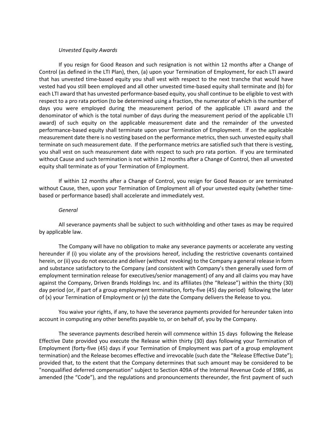 Unvested Equity Awards If you resign for Good Reason and such resignation is not within 12 months after a Change of Control (as defined in the LTI Plan), then, (a) upon your Termination of Employment, for each LTI award that has unvested time-based equity you shall vest with respect to the next tranche that would have vested had you still been employed and all other unvested time-based equity shall terminate and (b) for each LTI award that has unvested performance-based equity, you shall continue to be eligible to vest with respect to a pro rata portion (to be determined using a fraction, the numerator of which is the number of days you were employed during the measurement period of the applicable LTI award and the denominator of which is the total number of days during the measurement period of the applicable LTI award) of such equity on the applicable measurement date and the remainder of the unvested performance-based equity shall terminate upon your Termination of Employment. If on the applicable measurement date there is no vesting based on the performance metrics, then such unvested equity shall terminate on such measurement date. If the performance metrics are satisfied such that there is vesting, you shall vest on such measurement date with respect to such pro rata portion. If you are terminated without Cause and such termination is not within 12 months after a Change of Control, then all unvested equity shall terminate as of your Termination of Employment. If within 12 months after a Change of Control, you resign for Good Reason or are terminated without Cause, then, upon your Termination of Employment all of your unvested equity (whether time- based or performance based) shall accelerate and immediately vest. General All severance payments shall be subject to such withholding and other taxes as may be required by applicable law. The Company will have no obligation to make any severance payments or accelerate any vesting hereunder if (i) you violate any of the provisions hereof, including the restrictive covenants contained herein, or (ii) you do not execute and deliver (without revoking) to the Company a general release in form and substance satisfactory to the Company (and consistent with Company’s then generally used form of employment termination release for executives/senior management) of any and all claims you may have against the Company, Driven Brands Holdings Inc. and its affiliates (the “Release”) within the thirty (30) day period (or, if part of a group employment termination, forty-five (45) day period) following the later of (x) your Termination of Employment or (y) the date the Company delivers the Release to you. You waive your rights, if any, to have the severance payments provided for hereunder taken into account in computing any other benefits payable to, or on behalf of, you by the Company. The severance payments described herein will commence within 15 days following the Release Effective Date provided you execute the Release within thirty (30) days following your Termination of Employment (forty-five (45) days if your Termination of Employment was part of a group employment termination) and the Release becomes effective and irrevocable (such date the “Release Effective Date”); provided that, to the extent that the Company determines that such amount may be considered to be "nonqualified deferred compensation" subject to Section 409A of the Internal Revenue Code of 1986, as amended (the “Code”), and the regulations and pronouncements thereunder, the first payment of such