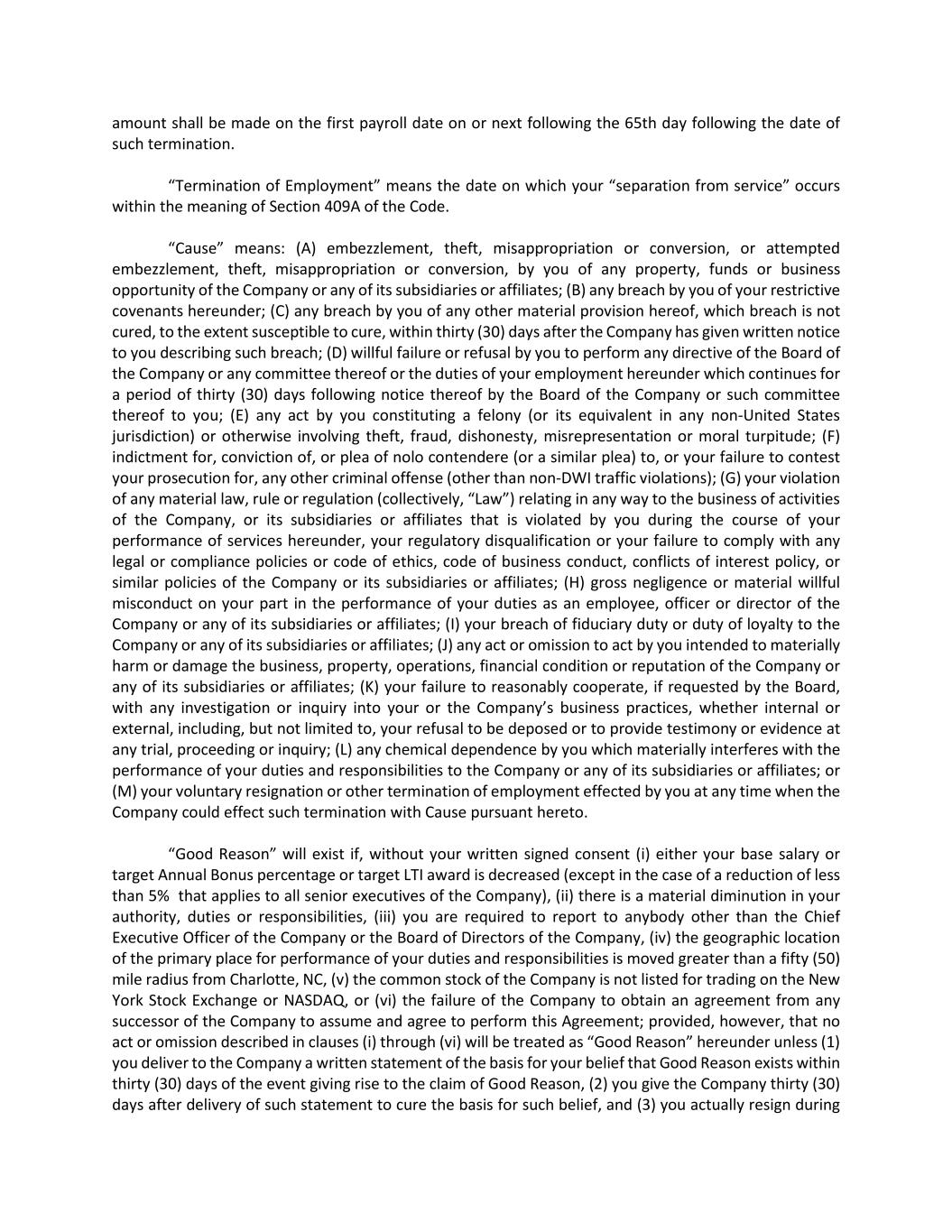 amount shall be made on the first payroll date on or next following the 65th day following the date of such termination. “Termination of Employment” means the date on which your “separation from service” occurs within the meaning of Section 409A of the Code. “Cause” means: (A) embezzlement, theft, misappropriation or conversion, or attempted embezzlement, theft, misappropriation or conversion, by you of any property, funds or business opportunity of the Company or any of its subsidiaries or affiliates; (B) any breach by you of your restrictive covenants hereunder; (C) any breach by you of any other material provision hereof, which breach is not cured, to the extent susceptible to cure, within thirty (30) days after the Company has given written notice to you describing such breach; (D) willful failure or refusal by you to perform any directive of the Board of the Company or any committee thereof or the duties of your employment hereunder which continues for a period of thirty (30) days following notice thereof by the Board of the Company or such committee thereof to you; (E) any act by you constituting a felony (or its equivalent in any non-United States jurisdiction) or otherwise involving theft, fraud, dishonesty, misrepresentation or moral turpitude; (F) indictment for, conviction of, or plea of nolo contendere (or a similar plea) to, or your failure to contest your prosecution for, any other criminal offense (other than non-DWI traffic violations); (G) your violation of any material law, rule or regulation (collectively, “Law”) relating in any way to the business of activities of the Company, or its subsidiaries or affiliates that is violated by you during the course of your performance of services hereunder, your regulatory disqualification or your failure to comply with any legal or compliance policies or code of ethics, code of business conduct, conflicts of interest policy, or similar policies of the Company or its subsidiaries or affiliates; (H) gross negligence or material willful misconduct on your part in the performance of your duties as an employee, officer or director of the Company or any of its subsidiaries or affiliates; (I) your breach of fiduciary duty or duty of loyalty to the Company or any of its subsidiaries or affiliates; (J) any act or omission to act by you intended to materially harm or damage the business, property, operations, financial condition or reputation of the Company or any of its subsidiaries or affiliates; (K) your failure to reasonably cooperate, if requested by the Board, with any investigation or inquiry into your or the Company’s business practices, whether internal or external, including, but not limited to, your refusal to be deposed or to provide testimony or evidence at any trial, proceeding or inquiry; (L) any chemical dependence by you which materially interferes with the performance of your duties and responsibilities to the Company or any of its subsidiaries or affiliates; or (M) your voluntary resignation or other termination of employment effected by you at any time when the Company could effect such termination with Cause pursuant hereto. “Good Reason” will exist if, without your written signed consent (i) either your base salary or target Annual Bonus percentage or target LTI award is decreased (except in the case of a reduction of less than 5% that applies to all senior executives of the Company), (ii) there is a material diminution in your authority, duties or responsibilities, (iii) you are required to report to anybody other than the Chief Executive Officer of the Company or the Board of Directors of the Company, (iv) the geographic location of the primary place for performance of your duties and responsibilities is moved greater than a fifty (50) mile radius from Charlotte, NC, (v) the common stock of the Company is not listed for trading on the New York Stock Exchange or NASDAQ, or (vi) the failure of the Company to obtain an agreement from any successor of the Company to assume and agree to perform this Agreement; provided, however, that no act or omission described in clauses (i) through (vi) will be treated as “Good Reason” hereunder unless (1) you deliver to the Company a written statement of the basis for your belief that Good Reason exists within thirty (30) days of the event giving rise to the claim of Good Reason, (2) you give the Company thirty (30) days after delivery of such statement to cure the basis for such belief, and (3) you actually resign during