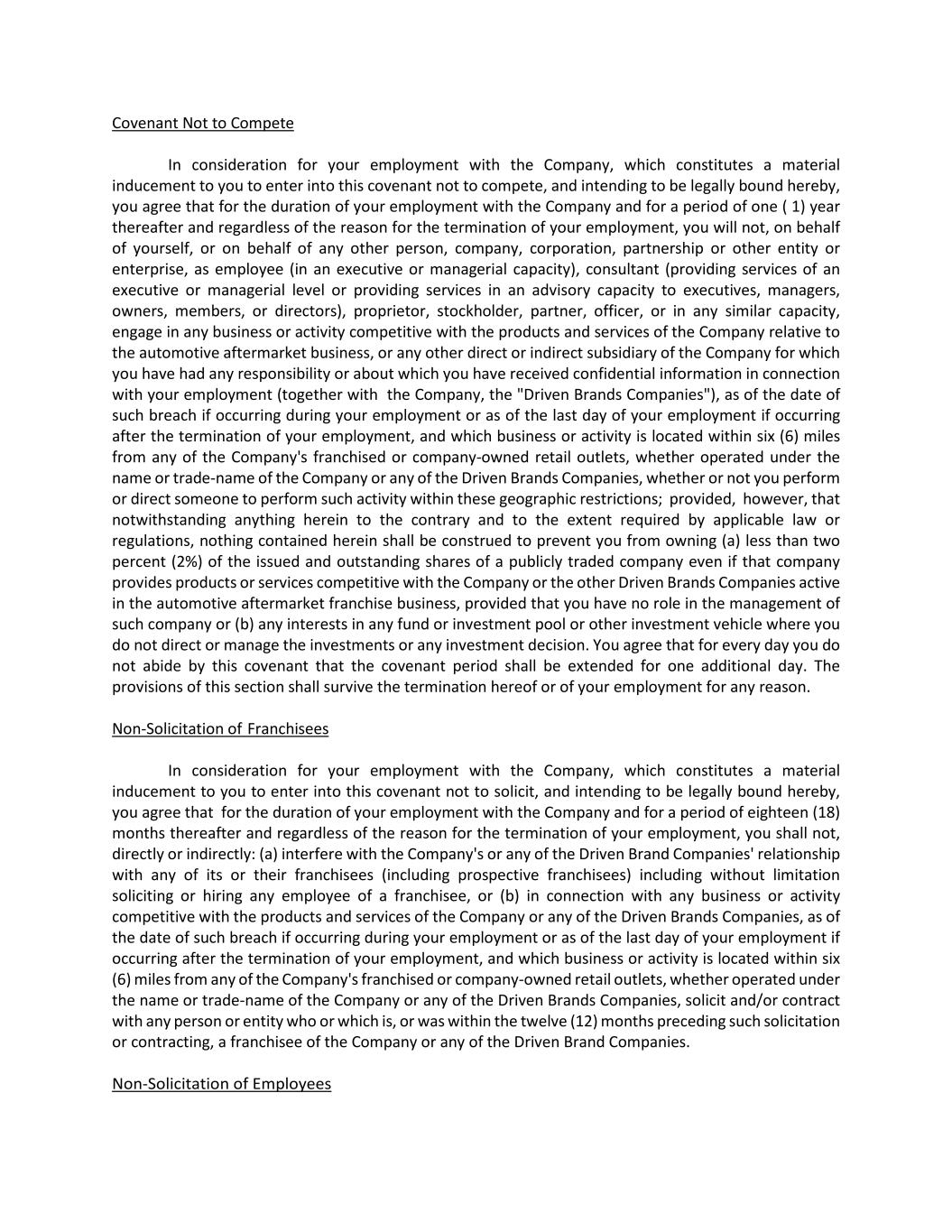 Covenant Not to Compete In consideration for your employment with the Company, which constitutes a material inducement to you to enter into this covenant not to compete, and intending to be legally bound hereby, you agree that for the duration of your employment with the Company and for a period of one ( 1) year thereafter and regardless of the reason for the termination of your employment, you will not, on behalf of yourself, or on behalf of any other person, company, corporation, partnership or other entity or enterprise, as employee (in an executive or managerial capacity), consultant (providing services of an executive or managerial level or providing services in an advisory capacity to executives, managers, owners, members, or directors), proprietor, stockholder, partner, officer, or in any similar capacity, engage in any business or activity competitive with the products and services of the Company relative to the automotive aftermarket business, or any other direct or indirect subsidiary of the Company for which you have had any responsibility or about which you have received confidential information in connection with your employment (together with the Company, the "Driven Brands Companies"), as of the date of such breach if occurring during your employment or as of the last day of your employment if occurring after the termination of your employment, and which business or activity is located within six (6) miles from any of the Company's franchised or company-owned retail outlets, whether operated under the name or trade-name of the Company or any of the Driven Brands Companies, whether or not you perform or direct someone to perform such activity within these geographic restrictions; provided, however, that notwithstanding anything herein to the contrary and to the extent required by applicable law or regulations, nothing contained herein shall be construed to prevent you from owning (a) less than two percent (2%) of the issued and outstanding shares of a publicly traded company even if that company provides products or services competitive with the Company or the other Driven Brands Companies active in the automotive aftermarket franchise business, provided that you have no role in the management of such company or (b) any interests in any fund or investment pool or other investment vehicle where you do not direct or manage the investments or any investment decision. You agree that for every day you do not abide by this covenant that the covenant period shall be extended for one additional day. The provisions of this section shall survive the termination hereof or of your employment for any reason. Non-Solicitation of Franchisees In consideration for your employment with the Company, which constitutes a material inducement to you to enter into this covenant not to solicit, and intending to be legally bound hereby, you agree that for the duration of your employment with the Company and for a period of eighteen (18) months thereafter and regardless of the reason for the termination of your employment, you shall not, directly or indirectly: (a) interfere with the Company's or any of the Driven Brand Companies' relationship with any of its or their franchisees (including prospective franchisees) including without limitation soliciting or hiring any employee of a franchisee, or (b) in connection with any business or activity competitive with the products and services of the Company or any of the Driven Brands Companies, as of the date of such breach if occurring during your employment or as of the last day of your employment if occurring after the termination of your employment, and which business or activity is located within six (6) miles from any of the Company's franchised or company-owned retail outlets, whether operated under the name or trade-name of the Company or any of the Driven Brands Companies, solicit and/or contract with any person or entity who or which is, or was within the twelve (12) months preceding such solicitation or contracting, a franchisee of the Company or any of the Driven Brand Companies. Non-Solicitation of Employees