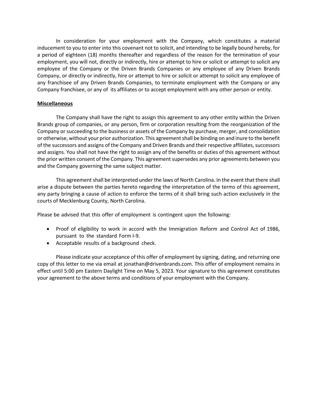 In consideration for your employment with the Company, which constitutes a material inducement to you to enter into this covenant not to solicit, and intending to be legally bound hereby, for a period of eighteen (18) months thereafter and regardless of the reason for the termination of your employment, you will not, directly or indirectly, hire or attempt to hire or solicit or attempt to solicit any employee of the Company or the Driven Brands Companies or any employee of any Driven Brands Company, or directly or indirectly, hire or attempt to hire or solicit or attempt to solicit any employee of any franchisee of any Driven Brands Companies, to terminate employment with the Company or any Company franchisee, or any of its affiliates or to accept employment with any other person or entity. Miscellaneous The Company shall have the right to assign this agreement to any other entity within the Driven Brands group of companies, or any person, firm or corporation resulting from the reorganization of the Company or succeeding to the business or assets of the Company by purchase, merger, and consolidation or otherwise, without your prior authorization. This agreement shall be binding on and inure to the benefit of the successors and assigns of the Company and Driven Brands and their respective affiliates, successors and assigns. You shall not have the right to assign any of the benefits or duties of this agreement without the prior written consent of the Company. This agreement supersedes any prior agreements between you and the Company governing the same subject matter. This agreement shall be interpreted under the laws of North Carolina. In the event that there shall arise a dispute between the parties hereto regarding the interpretation of the terms of this agreement, any party bringing a cause of action to enforce the terms of it shall bring such action exclusively in the courts of Mecklenburg County, North Carolina. Please be advised that this offer of employment is contingent upon the following: • Proof of eligibility to work in accord with the Immigration Reform and Control Act of 1986, pursuant to the standard Form I-9. • Acceptable results of a background check. Please indicate your acceptance of this offer of employment by signing, dating, and returning one copy of this letter to me via email at jonathan@drivenbrands.com. This offer of employment remains in effect until 5:00 pm Eastern Daylight Time on May 5, 2023. Your signature to this agreement constitutes your agreement to the above terms and conditions of your employment with the Company.