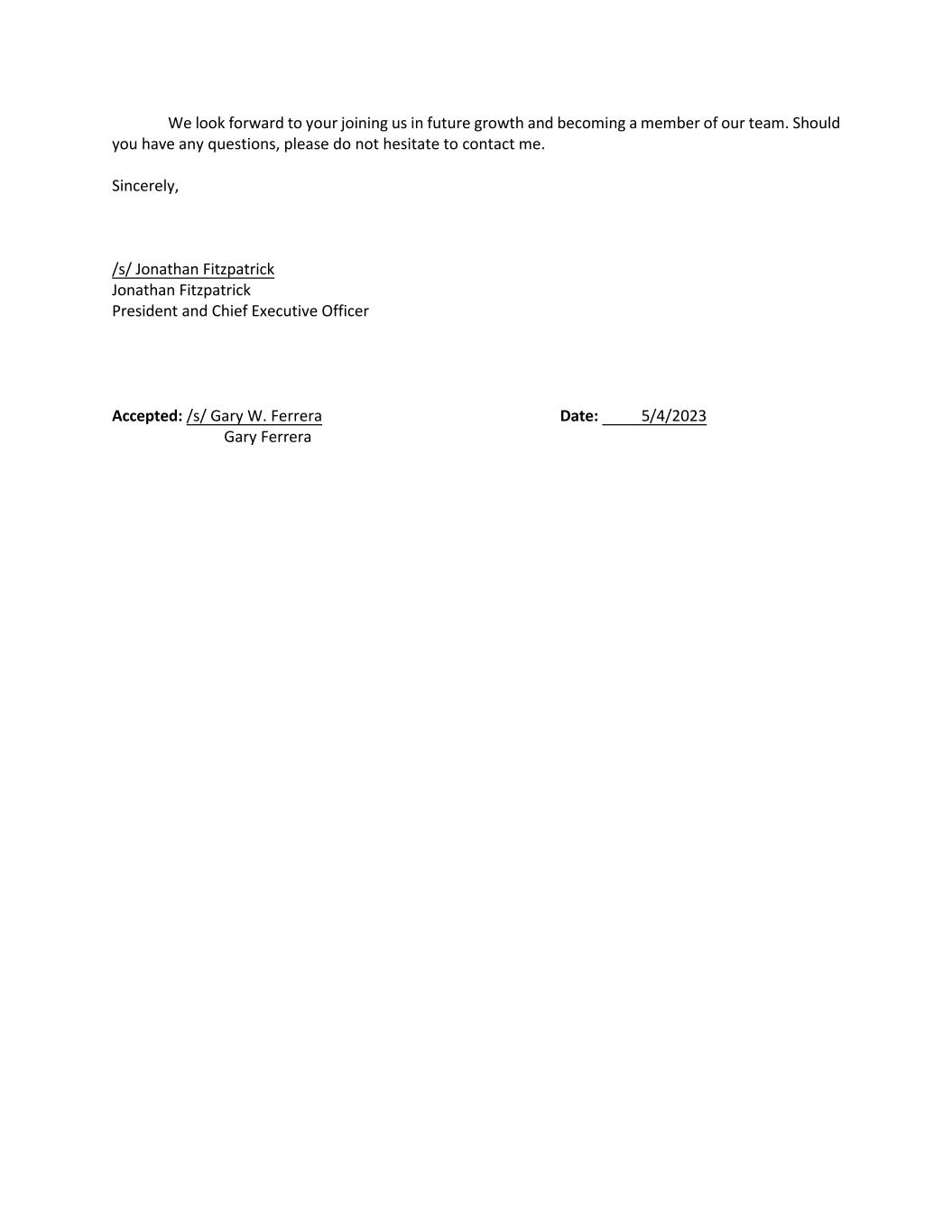 We look forward to your joining us in future growth and becoming a member of our team. Should you have any questions, please do not hesitate to contact me. Sincerely, /s/ Jonathan Fitzpatrick Jonathan Fitzpatrick President and Chief Executive Officer Accepted: /s/ Gary W. Ferrera Date: 5/4/2023 Gary Ferrera