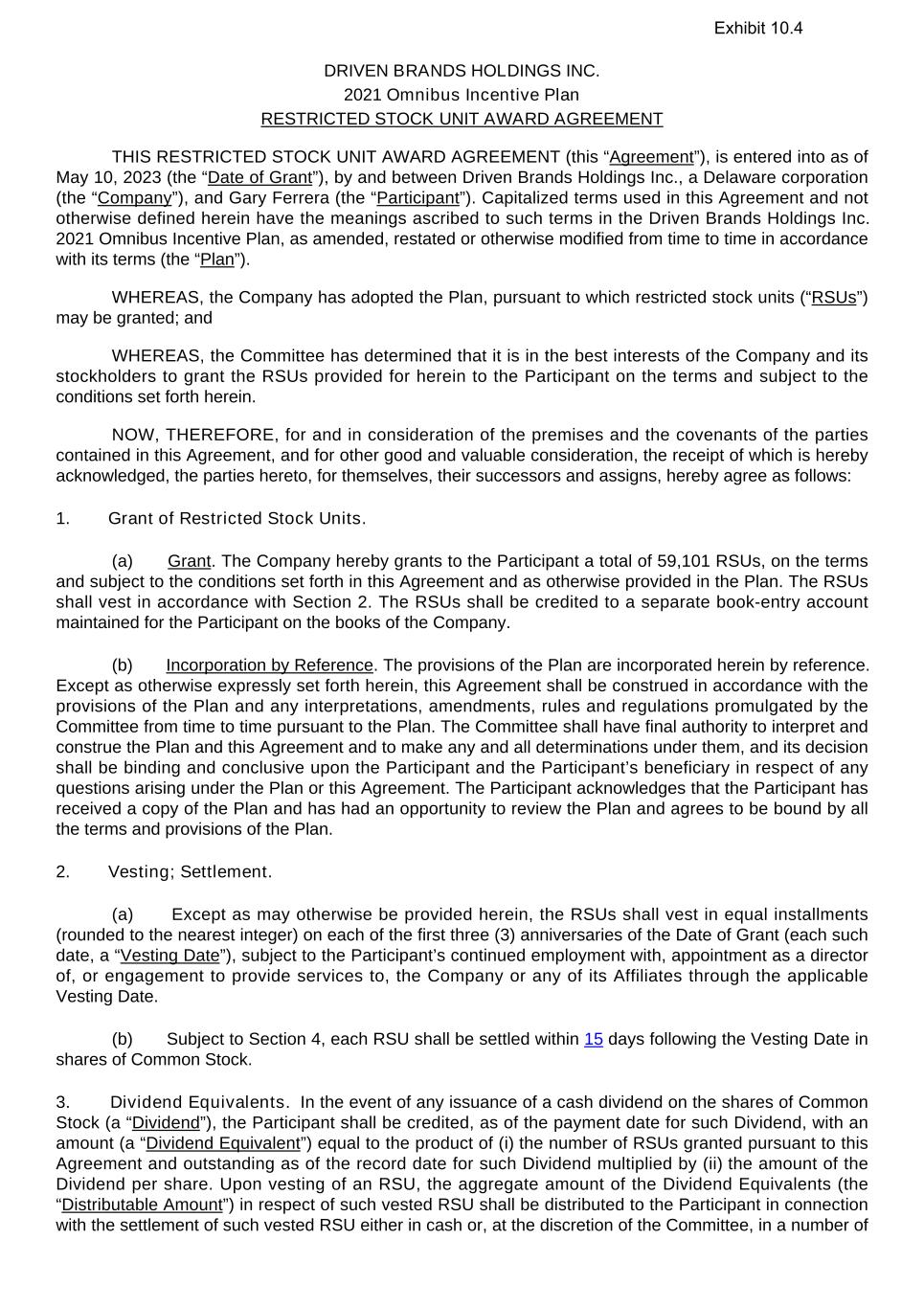 DRIVEN BRANDS HOLDINGS INC. 2021 Omnibus Incentive Plan RESTRICTED STOCK UNIT AWARD AGREEMENT THIS RESTRICTED STOCK UNIT AWARD AGREEMENT (this “Agreement”), is entered into as of May 10, 2023 (the “Date of Grant”), by and between Driven Brands Holdings Inc., a Delaware corporation (the “Company”), and Gary Ferrera (the “Participant”). Capitalized terms used in this Agreement and not otherwise defined herein have the meanings ascribed to such terms in the Driven Brands Holdings Inc. 2021 Omnibus Incentive Plan, as amended, restated or otherwise modified from time to time in accordance with its terms (the “Plan”). WHEREAS, the Company has adopted the Plan, pursuant to which restricted stock units (“RSUs”) may be granted; and WHEREAS, the Committee has determined that it is in the best interests of the Company and its stockholders to grant the RSUs provided for herein to the Participant on the terms and subject to the conditions set forth herein. NOW, THEREFORE, for and in consideration of the premises and the covenants of the parties contained in this Agreement, and for other good and valuable consideration, the receipt of which is hereby acknowledged, the parties hereto, for themselves, their successors and assigns, hereby agree as follows: 1. Grant of Restricted Stock Units. (a) Grant. The Company hereby grants to the Participant a total of 59,101 RSUs, on the terms and subject to the conditions set forth in this Agreement and as otherwise provided in the Plan. The RSUs shall vest in accordance with Section 2. The RSUs shall be credited to a separate book-entry account maintained for the Participant on the books of the Company. (b) Incorporation by Reference. The provisions of the Plan are incorporated herein by reference. Except as otherwise expressly set forth herein, this Agreement shall be construed in accordance with the provisions of the Plan and any interpretations, amendments, rules and regulations promulgated by the Committee from time to time pursuant to the Plan. The Committee shall have final authority to interpret and construe the Plan and this Agreement and to make any and all determinations under them, and its decision shall be binding and conclusive upon the Participant and the Participant’s beneficiary in respect of any questions arising under the Plan or this Agreement. The Participant acknowledges that the Participant has received a copy of the Plan and has had an opportunity to review the Plan and agrees to be bound by all the terms and provisions of the Plan. 2. Vesting; Settlement. (a) Except as may otherwise be provided herein, the RSUs shall vest in equal installments (rounded to the nearest integer) on each of the first three (3) anniversaries of the Date of Grant (each such date, a “Vesting Date”), subject to the Participant’s continued employment with, appointment as a director of, or engagement to provide services to, the Company or any of its Affiliates through the applicable Vesting Date.   (b) Subject to Section 4, each RSU shall be settled within 15 days following the Vesting Date in shares of Common Stock. 3. Dividend Equivalents.  In the event of any issuance of a cash dividend on the shares of Common Stock (a “Dividend”), the Participant shall be credited, as of the payment date for such Dividend, with an amount (a “Dividend Equivalent”) equal to the product of (i) the number of RSUs granted pursuant to this Agreement and outstanding as of the record date for such Dividend multiplied by (ii) the amount of the Dividend per share. Upon vesting of an RSU, the aggregate amount of the Dividend Equivalents (the “Distributable Amount”) in respect of such vested RSU shall be distributed to the Participant in connection with the settlement of such vested RSU either in cash or, at the discretion of the Committee, in a number of Exhibit 10.4