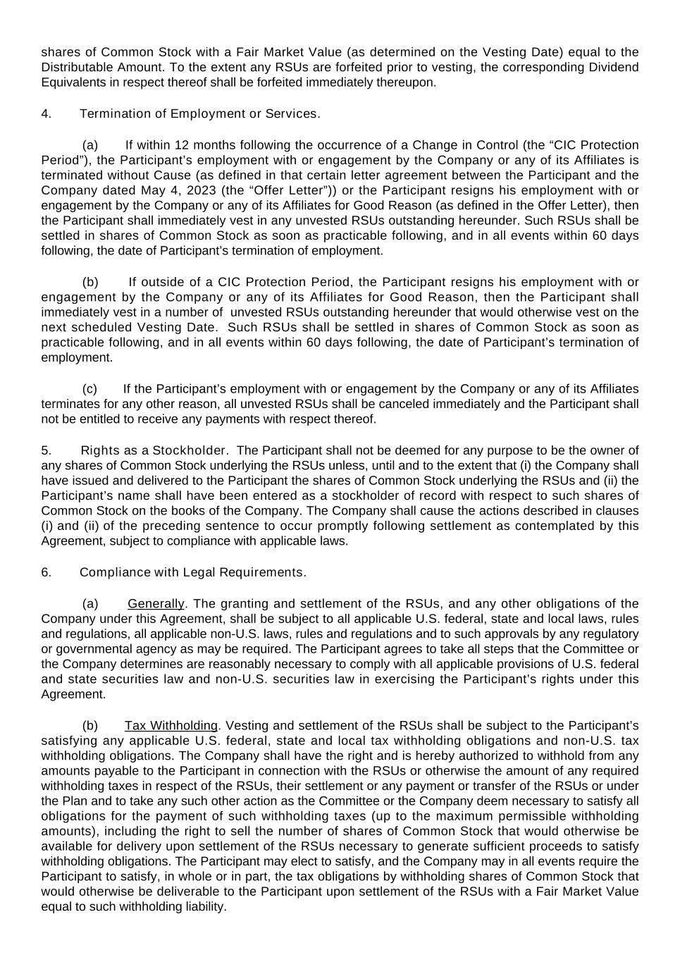 shares of Common Stock with a Fair Market Value (as determined on the Vesting Date) equal to the Distributable Amount. To the extent any RSUs are forfeited prior to vesting, the corresponding Dividend Equivalents in respect thereof shall be forfeited immediately thereupon. 4.              Termination of Employment or Services.  (a)            If within 12 months following the occurrence of a Change in Control (the “CIC Protection Period”), the Participant’s employment with or engagement by the Company or any of its Affiliates is terminated without Cause (as defined in that certain letter agreement between the Participant and the Company dated May 4, 2023 (the “Offer Letter”)) or the Participant resigns his employment with or engagement by the Company or any of its Affiliates for Good Reason (as defined in the Offer Letter), then the Participant shall immediately vest in any unvested RSUs outstanding hereunder. Such RSUs shall be settled in shares of Common Stock as soon as practicable following, and in all events within 60 days following, the date of Participant’s termination of employment. (b)            If outside of a CIC Protection Period, the Participant resigns his employment with or engagement by the Company or any of its Affiliates for Good Reason, then the Participant shall immediately vest in a number of  unvested RSUs outstanding hereunder that would otherwise vest on the next scheduled Vesting Date.  Such RSUs shall be settled in shares of Common Stock as soon as practicable following, and in all events within 60 days following, the date of Participant’s termination of employment.  (c)            If the Participant’s employment with or engagement by the Company or any of its Affiliates terminates for any other reason, all unvested RSUs shall be canceled immediately and the Participant shall not be entitled to receive any payments with respect thereof. 5.              Rights as a Stockholder.  The Participant shall not be deemed for any purpose to be the owner of any shares of Common Stock underlying the RSUs unless, until and to the extent that (i) the Company shall have issued and delivered to the Participant the shares of Common Stock underlying the RSUs and (ii) the Participant’s name shall have been entered as a stockholder of record with respect to such shares of Common Stock on the books of the Company. The Company shall cause the actions described in clauses (i) and (ii) of the preceding sentence to occur promptly following settlement as contemplated by this Agreement, subject to compliance with applicable laws. 6.              Compliance with Legal Requirements.   (a)            Generally. The granting and settlement of the RSUs, and any other obligations of the Company under this Agreement, shall be subject to all applicable U.S. federal, state and local laws, rules and regulations, all applicable non-U.S. laws, rules and regulations and to such approvals by any regulatory or governmental agency as may be required. The Participant agrees to take all steps that the Committee or the Company determines are reasonably necessary to comply with all applicable provisions of U.S. federal and state securities law and non-U.S. securities law in exercising the Participant’s rights under this Agreement.   (b)            Tax Withholding. Vesting and settlement of the RSUs shall be subject to the Participant’s satisfying any applicable U.S. federal, state and local tax withholding obligations and non-U.S. tax withholding obligations. The Company shall have the right and is hereby authorized to withhold from any amounts payable to the Participant in connection with the RSUs or otherwise the amount of any required withholding taxes in respect of the RSUs, their settlement or any payment or transfer of the RSUs or under the Plan and to take any such other action as the Committee or the Company deem necessary to satisfy all obligations for the payment of such withholding taxes (up to the maximum permissible withholding amounts), including the right to sell the number of shares of Common Stock that would otherwise be available for delivery upon settlement of the RSUs necessary to generate sufficient proceeds to satisfy withholding obligations. The Participant may elect to satisfy, and the Company may in all events require the Participant to satisfy, in whole or in part, the tax obligations by withholding shares of Common Stock that would otherwise be deliverable to the Participant upon settlement of the RSUs with a Fair Market Value equal to such withholding liability.