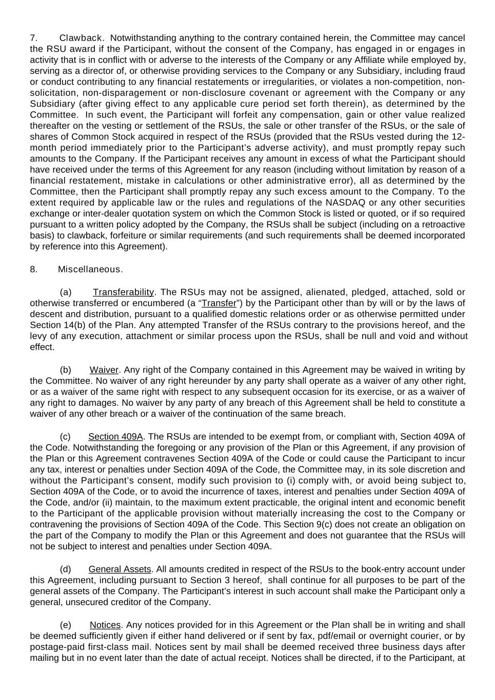 7.              Clawback.  Notwithstanding anything to the contrary contained herein, the Committee may cancel the RSU award if the Participant, without the consent of the Company, has engaged in or engages in activity that is in conflict with or adverse to the interests of the Company or any Affiliate while employed by, serving as a director of, or otherwise providing services to the Company or any Subsidiary, including fraud or conduct contributing to any financial restatements or irregularities, or violates a non-competition, non- solicitation, non-disparagement or non-disclosure covenant or agreement with the Company or any Subsidiary (after giving effect to any applicable cure period set forth therein), as determined by the Committee.  In such event, the Participant will forfeit any compensation, gain or other value realized thereafter on the vesting or settlement of the RSUs, the sale or other transfer of the RSUs, or the sale of shares of Common Stock acquired in respect of the RSUs (provided that the RSUs vested during the 12- month period immediately prior to the Participant’s adverse activity), and must promptly repay such amounts to the Company. If the Participant receives any amount in excess of what the Participant should have received under the terms of this Agreement for any reason (including without limitation by reason of a financial restatement, mistake in calculations or other administrative error), all as determined by the Committee, then the Participant shall promptly repay any such excess amount to the Company. To the extent required by applicable law or the rules and regulations of the NASDAQ or any other securities exchange or inter-dealer quotation system on which the Common Stock is listed or quoted, or if so required pursuant to a written policy adopted by the Company, the RSUs shall be subject (including on a retroactive basis) to clawback, forfeiture or similar requirements (and such requirements shall be deemed incorporated by reference into this Agreement). 8.              Miscellaneous. (a)            Transferability. The RSUs may not be assigned, alienated, pledged, attached, sold or otherwise transferred or encumbered (a “Transfer”) by the Participant other than by will or by the laws of descent and distribution, pursuant to a qualified domestic relations order or as otherwise permitted under Section 14(b) of the Plan. Any attempted Transfer of the RSUs contrary to the provisions hereof, and the levy of any execution, attachment or similar process upon the RSUs, shall be null and void and without effect. (b)            Waiver. Any right of the Company contained in this Agreement may be waived in writing by the Committee. No waiver of any right hereunder by any party shall operate as a waiver of any other right, or as a waiver of the same right with respect to any subsequent occasion for its exercise, or as a waiver of any right to damages. No waiver by any party of any breach of this Agreement shall be held to constitute a waiver of any other breach or a waiver of the continuation of the same breach. (c)            Section 409A. The RSUs are intended to be exempt from, or compliant with, Section 409A of the Code. Notwithstanding the foregoing or any provision of the Plan or this Agreement, if any provision of the Plan or this Agreement contravenes Section 409A of the Code or could cause the Participant to incur any tax, interest or penalties under Section 409A of the Code, the Committee may, in its sole discretion and without the Participant’s consent, modify such provision to (i) comply with, or avoid being subject to, Section 409A of the Code, or to avoid the incurrence of taxes, interest and penalties under Section 409A of the Code, and/or (ii) maintain, to the maximum extent practicable, the original intent and economic benefit to the Participant of the applicable provision without materially increasing the cost to the Company or contravening the provisions of Section 409A of the Code. This Section 9(c) does not create an obligation on the part of the Company to modify the Plan or this Agreement and does not guarantee that the RSUs will not be subject to interest and penalties under Section 409A. (d)            General Assets. All amounts credited in respect of the RSUs to the book-entry account under this Agreement, including pursuant to Section 3 hereof,  shall continue for all purposes to be part of the general assets of the Company. The Participant’s interest in such account shall make the Participant only a general, unsecured creditor of the Company. (e)            Notices. Any notices provided for in this Agreement or the Plan shall be in writing and shall be deemed sufficiently given if either hand delivered or if sent by fax, pdf/email or overnight courier, or by postage-paid first-class mail. Notices sent by mail shall be deemed received three business days after mailing but in no event later than the date of actual receipt. Notices shall be directed, if to the Participant, at