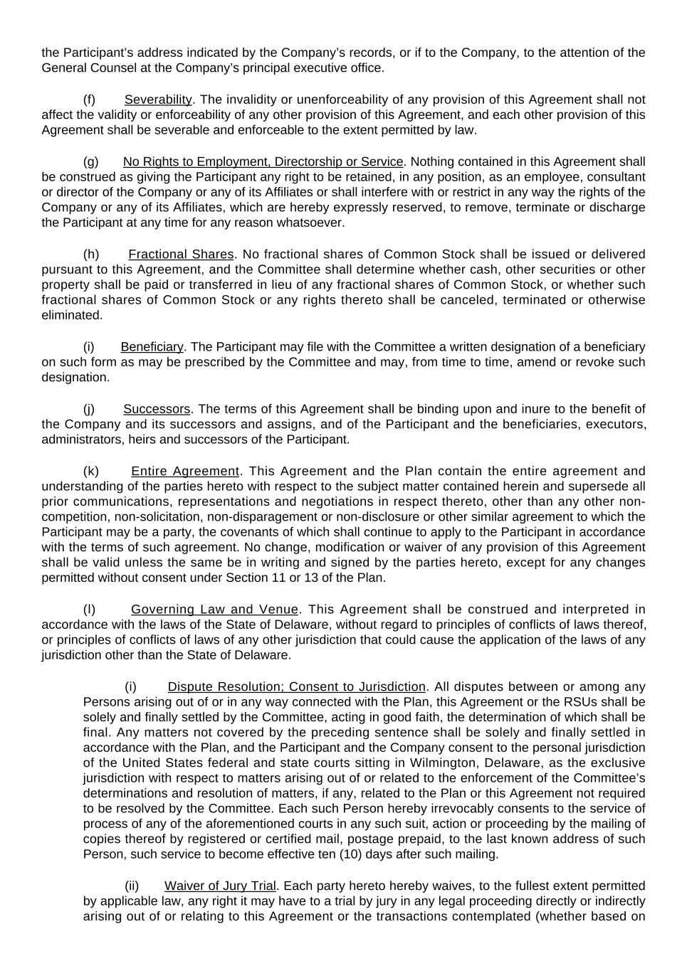 the Participant’s address indicated by the Company’s records, or if to the Company, to the attention of the General Counsel at the Company’s principal executive office. (f)             Severability. The invalidity or unenforceability of any provision of this Agreement shall not affect the validity or enforceability of any other provision of this Agreement, and each other provision of this Agreement shall be severable and enforceable to the extent permitted by law. (g)            No Rights to Employment, Directorship or Service. Nothing contained in this Agreement shall be construed as giving the Participant any right to be retained, in any position, as an employee, consultant or director of the Company or any of its Affiliates or shall interfere with or restrict in any way the rights of the Company or any of its Affiliates, which are hereby expressly reserved, to remove, terminate or discharge the Participant at any time for any reason whatsoever. (h)            Fractional Shares. No fractional shares of Common Stock shall be issued or delivered pursuant to this Agreement, and the Committee shall determine whether cash, other securities or other property shall be paid or transferred in lieu of any fractional shares of Common Stock, or whether such fractional shares of Common Stock or any rights thereto shall be canceled, terminated or otherwise eliminated. (i)             Beneficiary. The Participant may file with the Committee a written designation of a beneficiary on such form as may be prescribed by the Committee and may, from time to time, amend or revoke such designation. (j)             Successors. The terms of this Agreement shall be binding upon and inure to the benefit of the Company and its successors and assigns, and of the Participant and the beneficiaries, executors, administrators, heirs and successors of the Participant. (k)            Entire Agreement. This Agreement and the Plan contain the entire agreement and understanding of the parties hereto with respect to the subject matter contained herein and supersede all prior communications, representations and negotiations in respect thereto, other than any other non- competition, non-solicitation, non-disparagement or non-disclosure or other similar agreement to which the Participant may be a party, the covenants of which shall continue to apply to the Participant in accordance with the terms of such agreement. No change, modification or waiver of any provision of this Agreement shall be valid unless the same be in writing and signed by the parties hereto, except for any changes permitted without consent under Section 11 or 13 of the Plan. (l)             Governing Law and Venue. This Agreement shall be construed and interpreted in accordance with the laws of the State of Delaware, without regard to principles of conflicts of laws thereof, or principles of conflicts of laws of any other jurisdiction that could cause the application of the laws of any jurisdiction other than the State of Delaware.  (i)             Dispute Resolution; Consent to Jurisdiction. All disputes between or among any Persons arising out of or in any way connected with the Plan, this Agreement or the RSUs shall be solely and finally settled by the Committee, acting in good faith, the determination of which shall be final. Any matters not covered by the preceding sentence shall be solely and finally settled in accordance with the Plan, and the Participant and the Company consent to the personal jurisdiction of the United States federal and state courts sitting in Wilmington, Delaware, as the exclusive jurisdiction with respect to matters arising out of or related to the enforcement of the Committee’s determinations and resolution of matters, if any, related to the Plan or this Agreement not required to be resolved by the Committee. Each such Person hereby irrevocably consents to the service of process of any of the aforementioned courts in any such suit, action or proceeding by the mailing of copies thereof by registered or certified mail, postage prepaid, to the last known address of such Person, such service to become effective ten (10) days after such mailing. (ii)            Waiver of Jury Trial. Each party hereto hereby waives, to the fullest extent permitted by applicable law, any right it may have to a trial by jury in any legal proceeding directly or indirectly arising out of or relating to this Agreement or the transactions contemplated (whether based on