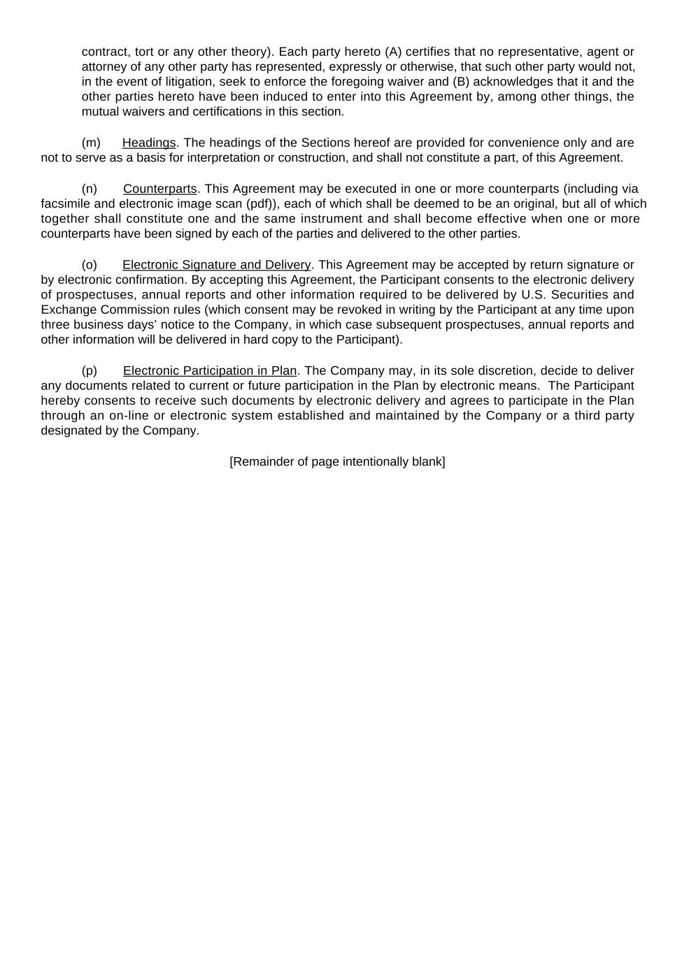 contract, tort or any other theory). Each party hereto (A) certifies that no representative, agent or attorney of any other party has represented, expressly or otherwise, that such other party would not, in the event of litigation, seek to enforce the foregoing waiver and (B) acknowledges that it and the other parties hereto have been induced to enter into this Agreement by, among other things, the mutual waivers and certifications in this section.  (m)          Headings. The headings of the Sections hereof are provided for convenience only and are not to serve as a basis for interpretation or construction, and shall not constitute a part, of this Agreement.  (n)            Counterparts. This Agreement may be executed in one or more counterparts (including via facsimile and electronic image scan (pdf)), each of which shall be deemed to be an original, but all of which together shall constitute one and the same instrument and shall become effective when one or more counterparts have been signed by each of the parties and delivered to the other parties. (o)            Electronic Signature and Delivery. This Agreement may be accepted by return signature or by electronic confirmation. By accepting this Agreement, the Participant consents to the electronic delivery of prospectuses, annual reports and other information required to be delivered by U.S. Securities and Exchange Commission rules (which consent may be revoked in writing by the Participant at any time upon three business days’ notice to the Company, in which case subsequent prospectuses, annual reports and other information will be delivered in hard copy to the Participant). (p)            Electronic Participation in Plan. The Company may, in its sole discretion, decide to deliver any documents related to current or future participation in the Plan by electronic means.  The Participant hereby consents to receive such documents by electronic delivery and agrees to participate in the Plan through an on-line or electronic system established and maintained by the Company or a third party designated by the Company. [Remainder of page intentionally blank]