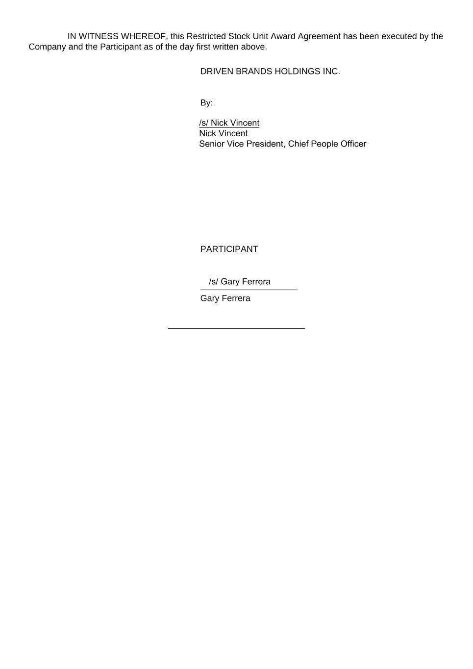 IN WITNESS WHEREOF, this Restricted Stock Unit Award Agreement has been executed by the Company and the Participant as of the day first written above. DRIVEN BRANDS HOLDINGS INC. By:  PARTICIPANT Gary Ferrera /s/ Nick Vincent Nick Vincent Senior Vice President, Chief People Officer /s/ Gary Ferrera