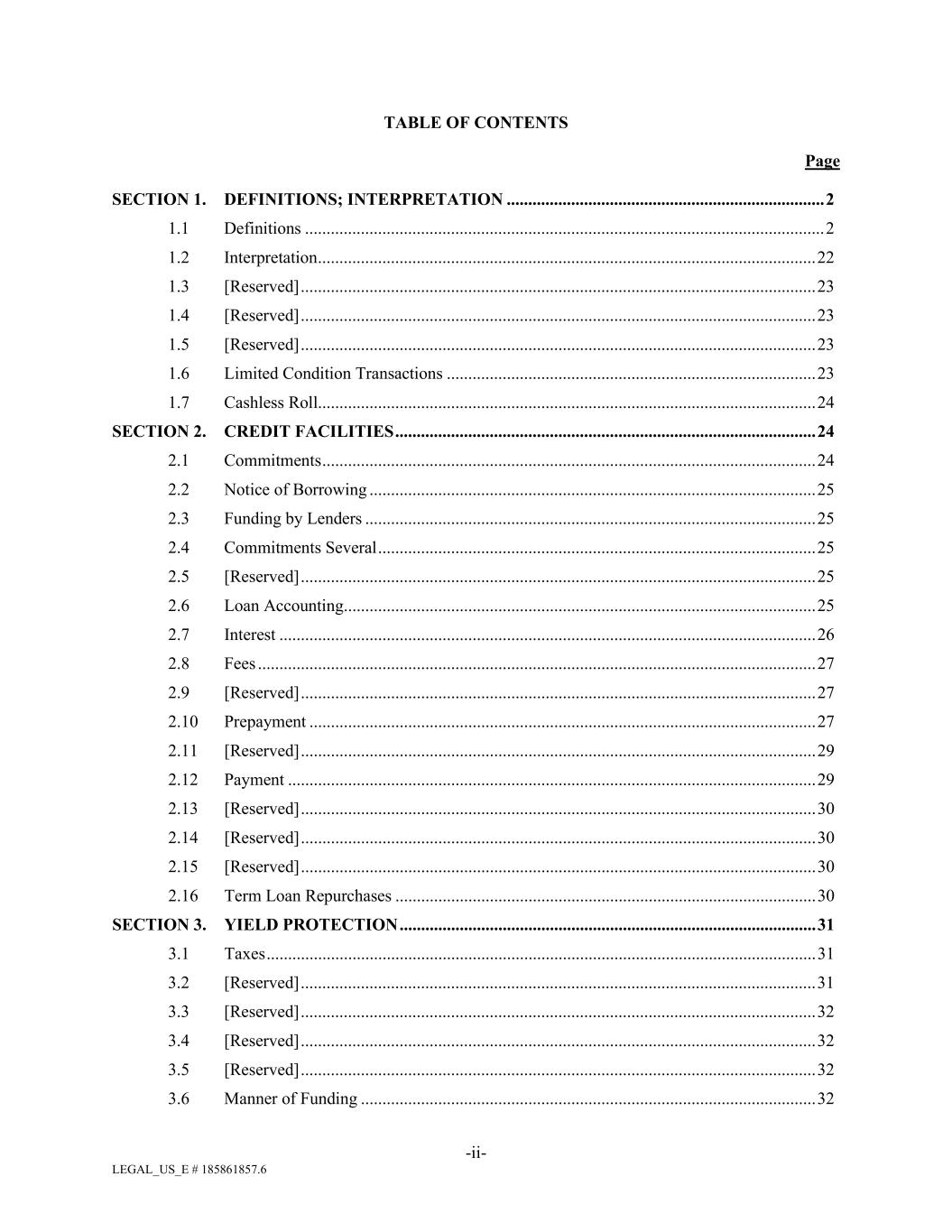 -ii- LEGAL_US_E # 185861857.6 TABLE OF CONTENTS Page SECTION 1. DEFINITIONS; INTERPRETATION .......................................................................... 2 1.1 Definitions ......................................................................................................................... 2 1.2 Interpretation .................................................................................................................... 22 1.3 [Reserved] ........................................................................................................................ 23 1.4 [Reserved] ........................................................................................................................ 23 1.5 [Reserved] ........................................................................................................................ 23 1.6 Limited Condition Transactions ...................................................................................... 23 1.7 Cashless Roll.................................................................................................................... 24 SECTION 2. CREDIT FACILITIES .................................................................................................. 24 2.1 Commitments ................................................................................................................... 24 2.2 Notice of Borrowing ........................................................................................................ 25 2.3 Funding by Lenders ......................................................................................................... 25 2.4 Commitments Several ...................................................................................................... 25 2.5 [Reserved] ........................................................................................................................ 25 2.6 Loan Accounting .............................................................................................................. 25 2.7 Interest ............................................................................................................................. 26 2.8 Fees .................................................................................................................................. 27 2.9 [Reserved] ........................................................................................................................ 27 2.10 Prepayment ...................................................................................................................... 27 2.11 [Reserved] ........................................................................................................................ 29 2.12 Payment ........................................................................................................................... 29 2.13 [Reserved] ........................................................................................................................ 30 2.14 [Reserved] ........................................................................................................................ 30 2.15 [Reserved] ........................................................................................................................ 30 2.16 Term Loan Repurchases .................................................................................................. 30 SECTION 3. YIELD PROTECTION ................................................................................................. 31 3.1 Taxes ................................................................................................................................ 31 3.2 [Reserved] ........................................................................................................................ 31 3.3 [Reserved] ........................................................................................................................ 32 3.4 [Reserved] ........................................................................................................................ 32 3.5 [Reserved] ........................................................................................................................ 32 3.6 Manner of Funding .......................................................................................................... 32