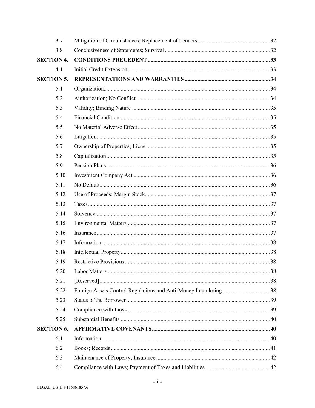 -iii- LEGAL_US_E # 185861857.6 3.7 Mitigation of Circumstances; Replacement of Lenders ................................................... 32 3.8 Conclusiveness of Statements; Survival .......................................................................... 32 SECTION 4. CONDITIONS PRECEDENT ...................................................................................... 33 4.1 Initial Credit Extension .................................................................................................... 33 SECTION 5. REPRESENTATIONS AND WARRANTIES ............................................................ 34 5.1 Organization..................................................................................................................... 34 5.2 Authorization; No Conflict .............................................................................................. 34 5.3 Validity; Binding Nature ................................................................................................. 35 5.4 Financial Condition .......................................................................................................... 35 5.5 No Material Adverse Effect ............................................................................................. 35 5.6 Litigation .......................................................................................................................... 35 5.7 Ownership of Properties; Liens ....................................................................................... 35 5.8 Capitalization ................................................................................................................... 35 5.9 Pension Plans ................................................................................................................... 36 5.10 Investment Company Act ................................................................................................ 36 5.11 No Default........................................................................................................................ 36 5.12 Use of Proceeds; Margin Stock ........................................................................................ 37 5.13 Taxes ................................................................................................................................ 37 5.14 Solvency........................................................................................................................... 37 5.15 Environmental Matters .................................................................................................... 37 5.16 Insurance .......................................................................................................................... 37 5.17 Information ...................................................................................................................... 38 5.18 Intellectual Property ......................................................................................................... 38 5.19 Restrictive Provisions ...................................................................................................... 38 5.20 Labor Matters ................................................................................................................... 38 5.21 [Reserved] ........................................................................................................................ 38 5.22 Foreign Assets Control Regulations and Anti-Money Laundering ................................. 38 5.23 Status of the Borrower ..................................................................................................... 39 5.24 Compliance with Laws .................................................................................................... 39 5.25 Substantial Benefits ......................................................................................................... 40 SECTION 6. AFFIRMATIVE COVENANTS ................................................................................... 40 6.1 Information ...................................................................................................................... 40 6.2 Books; Records ................................................................................................................ 41 6.3 Maintenance of Property; Insurance ................................................................................ 42 6.4 Compliance with Laws; Payment of Taxes and Liabilities .............................................. 42