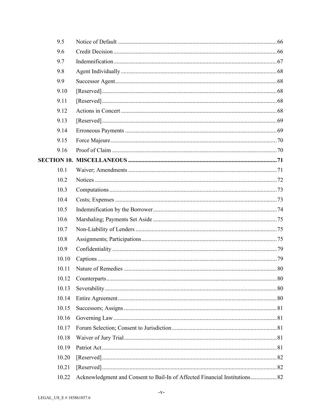 -v- LEGAL_US_E # 185861857.6 9.5 Notice of Default ............................................................................................................. 66 9.6 Credit Decision ................................................................................................................ 66 9.7 Indemnification ................................................................................................................ 67 9.8 Agent Individually ........................................................................................................... 68 9.9 Successor Agent ............................................................................................................... 68 9.10 [Reserved] ........................................................................................................................ 68 9.11 [Reserved] ........................................................................................................................ 68 9.12 Actions in Concert ........................................................................................................... 68 9.13 [Reserved] ........................................................................................................................ 69 9.14 Erroneous Payments ........................................................................................................ 69 9.15 Force Majeure .................................................................................................................. 70 9.16 Proof of Claim ................................................................................................................. 70 SECTION 10. MISCELLANEOUS ...................................................................................................... 71 10.1 Waiver; Amendments ...................................................................................................... 71 10.2 Notices ............................................................................................................................. 72 10.3 Computations ................................................................................................................... 73 10.4 Costs; Expenses ............................................................................................................... 73 10.5 Indemnification by the Borrower ..................................................................................... 74 10.6 Marshaling; Payments Set Aside ..................................................................................... 75 10.7 Non-Liability of Lenders ................................................................................................. 75 10.8 Assignments; Participations ............................................................................................. 75 10.9 Confidentiality ................................................................................................................. 79 10.10 Captions ........................................................................................................................... 79 10.11 Nature of Remedies ......................................................................................................... 80 10.12 Counterparts ..................................................................................................................... 80 10.13 Severability ...................................................................................................................... 80 10.14 Entire Agreement ............................................................................................................. 80 10.15 Successors; Assigns ......................................................................................................... 81 10.16 Governing Law ................................................................................................................ 81 10.17 Forum Selection; Consent to Jurisdiction ........................................................................ 81 10.18 Waiver of Jury Trial ......................................................................................................... 81 10.19 Patriot Act ........................................................................................................................ 81 10.20 [Reserved] ........................................................................................................................ 82 10.21 [Reserved] ........................................................................................................................ 82 10.22 Acknowledgment and Consent to Bail-In of Affected Financial Institutions .................. 82