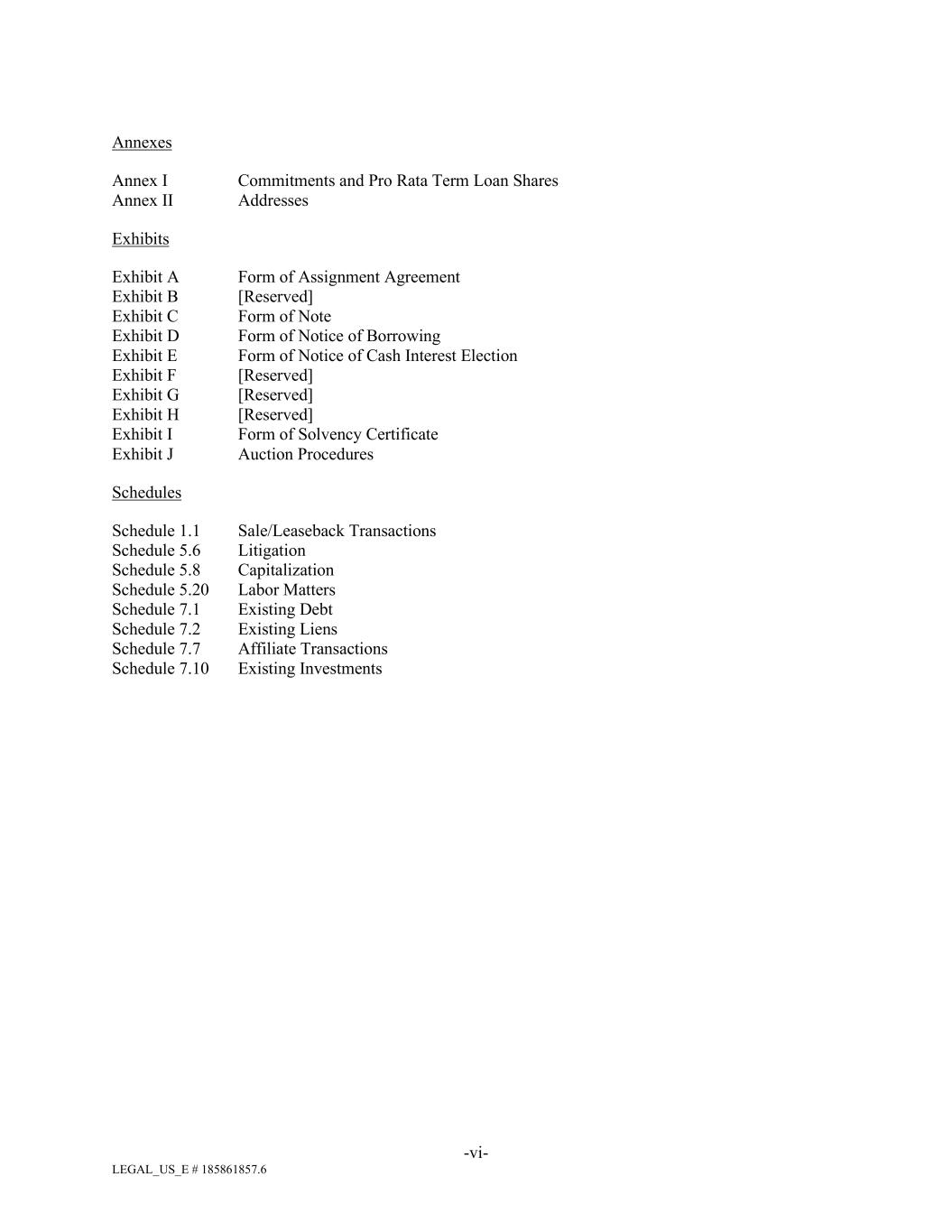 -vi- LEGAL_US_E # 185861857.6 Annexes Annex I Commitments and Pro Rata Term Loan Shares Annex II Addresses Exhibits Exhibit A Form of Assignment Agreement Exhibit B [Reserved] Exhibit C Form of Note Exhibit D Form of Notice of Borrowing Exhibit E Form of Notice of Cash Interest Election Exhibit F [Reserved] Exhibit G [Reserved] Exhibit H [Reserved] Exhibit I Form of Solvency Certificate Exhibit J Auction Procedures Schedules Schedule 1.1 Sale/Leaseback Transactions Schedule 5.6 Litigation Schedule 5.8 Capitalization Schedule 5.20 Labor Matters Schedule 7.1 Existing Debt Schedule 7.2 Existing Liens Schedule 7.7 Affiliate Transactions Schedule 7.10 Existing Investments
