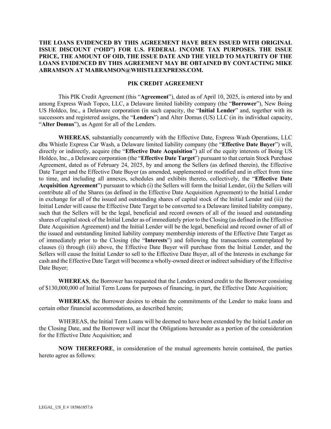 LEGAL_US_E # 185861857.6 THE LOANS EVIDENCED BY THIS AGREEMENT HAVE BEEN ISSUED WITH ORIGINAL ISSUE DISCOUNT (“OID”) FOR U.S. FEDERAL INCOME TAX PURPOSES. THE ISSUE PRICE, THE AMOUNT OF OID, THE ISSUE DATE AND THE YIELD TO MATURITY OF THE LOANS EVIDENCED BY THIS AGREEMENT MAY BE OBTAINED BY CONTACTING MIKE ABRAMSON AT MABRAMSON@WHISTLEEXPRESS.COM. PIK CREDIT AGREEMENT This PIK Credit Agreement (this “Agreement”), dated as of April 10, 2025, is entered into by and among Express Wash Topco, LLC, a Delaware limited liability company (the “Borrower”), New Boing US Holdco, Inc., a Delaware corporation (in such capacity, the “Initial Lender” and, together with its successors and registered assigns, the “Lenders”) and Alter Domus (US) LLC (in its individual capacity, “Alter Domus”), as Agent for all of the Lenders. WHEREAS, substantially concurrently with the Effective Date, Express Wash Operations, LLC dba Whistle Express Car Wash, a Delaware limited liability company (the “Effective Date Buyer”) will, directly or indirectly, acquire (the “Effective Date Acquisition”) all of the equity interests of Boing US Holdco, Inc., a Delaware corporation (the “Effective Date Target”) pursuant to that certain Stock Purchase Agreement, dated as of February 24, 2025, by and among the Sellers (as defined therein), the Effective Date Target and the Effective Date Buyer (as amended, supplemented or modified and in effect from time to time, and including all annexes, schedules and exhibits thereto, collectively, the “Effective Date Acquisition Agreement”) pursuant to which (i) the Sellers will form the Initial Lender, (ii) the Sellers will contribute all of the Shares (as defined in the Effective Date Acquisition Agreement) to the Initial Lender in exchange for all of the issued and outstanding shares of capital stock of the Initial Lender and (iii) the Initial Lender will cause the Effective Date Target to be converted to a Delaware limited liability company, such that the Sellers will be the legal, beneficial and record owners of all of the issued and outstanding shares of capital stock of the Initial Lender as of immediately prior to the Closing (as defined in the Effective Date Acquisition Agreement) and the Initial Lender will be the legal, beneficial and record owner of all of the issued and outstanding limited liability company membership interests of the Effective Date Target as of immediately prior to the Closing (the “Interests”) and following the transactions contemplated by clauses (i) through (iii) above, the Effective Date Buyer will purchase from the Initial Lender, and the Sellers will cause the Initial Lender to sell to the Effective Date Buyer, all of the Interests in exchange for cash and the Effective Date Target will become a wholly-owned direct or indirect subsidiary of the Effective Date Buyer; WHEREAS, the Borrower has requested that the Lenders extend credit to the Borrower consisting of $130,000,000 of Initial Term Loans for purposes of financing, in part, the Effective Date Acquisition; WHEREAS, the Borrower desires to obtain the commitments of the Lender to make loans and certain other financial accommodations, as described herein; WHEREAS, the Initial Term Loans will be deemed to have been extended by the Initial Lender on the Closing Date, and the Borrower will incur the Obligations hereunder as a portion of the consideration for the Effective Date Acquisition; and NOW THEREFORE, in consideration of the mutual agreements herein contained, the parties hereto agree as follows:
