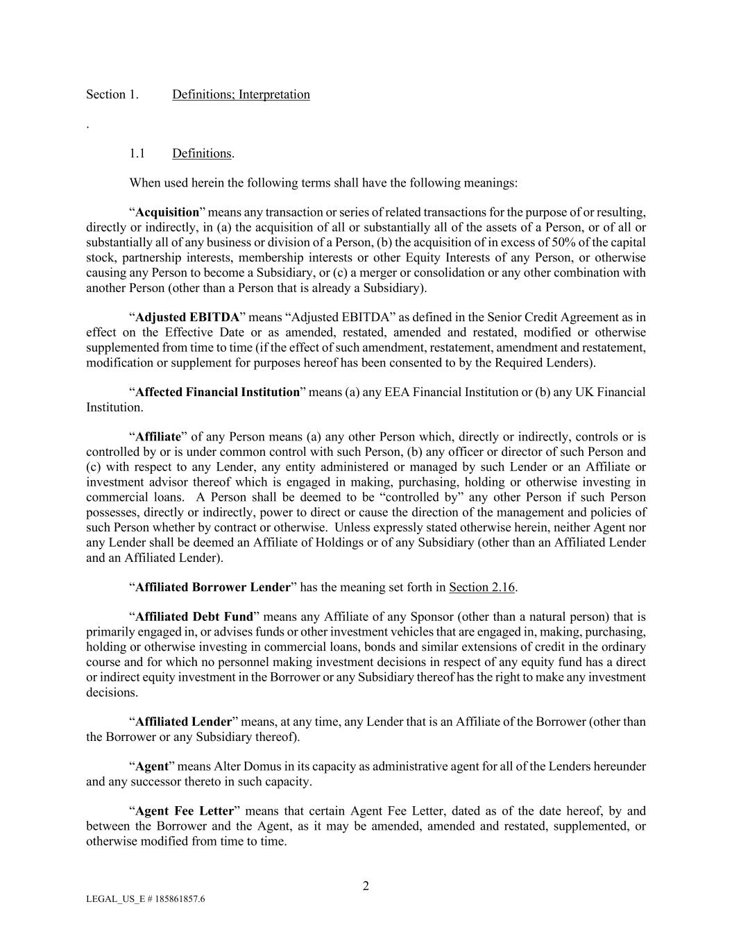 2 LEGAL_US_E # 185861857.6 Section 1. Definitions; Interpretation . 1.1 Definitions. When used herein the following terms shall have the following meanings: “Acquisition” means any transaction or series of related transactions for the purpose of or resulting, directly or indirectly, in (a) the acquisition of all or substantially all of the assets of a Person, or of all or substantially all of any business or division of a Person, (b) the acquisition of in excess of 50% of the capital stock, partnership interests, membership interests or other Equity Interests of any Person, or otherwise causing any Person to become a Subsidiary, or (c) a merger or consolidation or any other combination with another Person (other than a Person that is already a Subsidiary). “Adjusted EBITDA” means “Adjusted EBITDA” as defined in the Senior Credit Agreement as in effect on the Effective Date or as amended, restated, amended and restated, modified or otherwise supplemented from time to time (if the effect of such amendment, restatement, amendment and restatement, modification or supplement for purposes hereof has been consented to by the Required Lenders). “Affected Financial Institution” means (a) any EEA Financial Institution or (b) any UK Financial Institution. “Affiliate” of any Person means (a) any other Person which, directly or indirectly, controls or is controlled by or is under common control with such Person, (b) any officer or director of such Person and (c) with respect to any Lender, any entity administered or managed by such Lender or an Affiliate or investment advisor thereof which is engaged in making, purchasing, holding or otherwise investing in commercial loans. A Person shall be deemed to be “controlled by” any other Person if such Person possesses, directly or indirectly, power to direct or cause the direction of the management and policies of such Person whether by contract or otherwise. Unless expressly stated otherwise herein, neither Agent nor any Lender shall be deemed an Affiliate of Holdings or of any Subsidiary (other than an Affiliated Lender and an Affiliated Lender). “Affiliated Borrower Lender” has the meaning set forth in Section 2.16. “Affiliated Debt Fund” means any Affiliate of any Sponsor (other than a natural person) that is primarily engaged in, or advises funds or other investment vehicles that are engaged in, making, purchasing, holding or otherwise investing in commercial loans, bonds and similar extensions of credit in the ordinary course and for which no personnel making investment decisions in respect of any equity fund has a direct or indirect equity investment in the Borrower or any Subsidiary thereof has the right to make any investment decisions. “Affiliated Lender” means, at any time, any Lender that is an Affiliate of the Borrower (other than the Borrower or any Subsidiary thereof). “Agent” means Alter Domus in its capacity as administrative agent for all of the Lenders hereunder and any successor thereto in such capacity. “Agent Fee Letter” means that certain Agent Fee Letter, dated as of the date hereof, by and between the Borrower and the Agent, as it may be amended, amended and restated, supplemented, or otherwise modified from time to time.