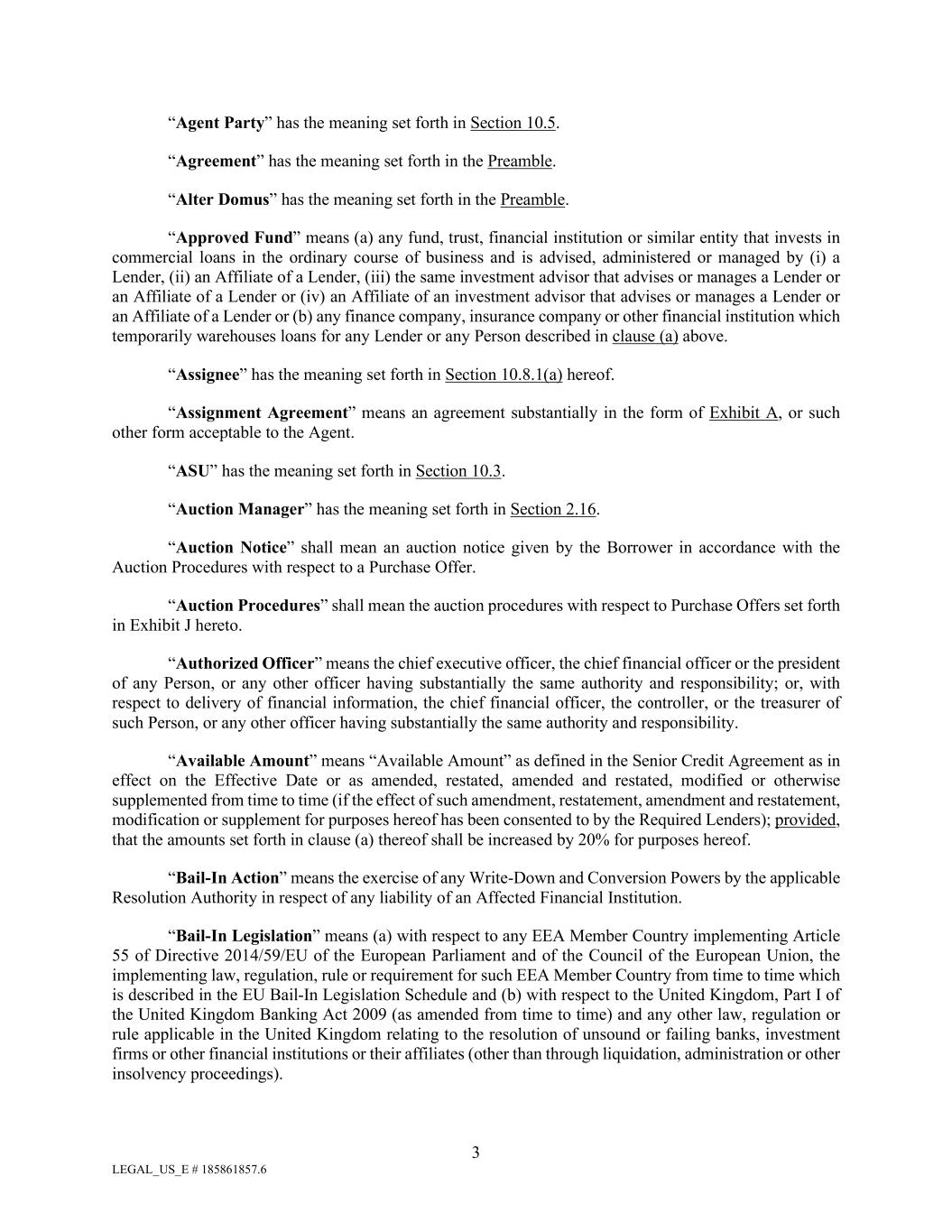 3 LEGAL_US_E # 185861857.6 “Agent Party” has the meaning set forth in Section 10.5. “Agreement” has the meaning set forth in the Preamble. “Alter Domus” has the meaning set forth in the Preamble. “Approved Fund” means (a) any fund, trust, financial institution or similar entity that invests in commercial loans in the ordinary course of business and is advised, administered or managed by (i) a Lender, (ii) an Affiliate of a Lender, (iii) the same investment advisor that advises or manages a Lender or an Affiliate of a Lender or (iv) an Affiliate of an investment advisor that advises or manages a Lender or an Affiliate of a Lender or (b) any finance company, insurance company or other financial institution which temporarily warehouses loans for any Lender or any Person described in clause (a) above. “Assignee” has the meaning set forth in Section 10.8.1(a) hereof. “Assignment Agreement” means an agreement substantially in the form of Exhibit A, or such other form acceptable to the Agent. “ASU” has the meaning set forth in Section 10.3. “Auction Manager” has the meaning set forth in Section 2.16. “Auction Notice” shall mean an auction notice given by the Borrower in accordance with the Auction Procedures with respect to a Purchase Offer. “Auction Procedures” shall mean the auction procedures with respect to Purchase Offers set forth in Exhibit J hereto. “Authorized Officer” means the chief executive officer, the chief financial officer or the president of any Person, or any other officer having substantially the same authority and responsibility; or, with respect to delivery of financial information, the chief financial officer, the controller, or the treasurer of such Person, or any other officer having substantially the same authority and responsibility. “Available Amount” means “Available Amount” as defined in the Senior Credit Agreement as in effect on the Effective Date or as amended, restated, amended and restated, modified or otherwise supplemented from time to time (if the effect of such amendment, restatement, amendment and restatement, modification or supplement for purposes hereof has been consented to by the Required Lenders); provided, that the amounts set forth in clause (a) thereof shall be increased by 20% for purposes hereof. “Bail-In Action” means the exercise of any Write-Down and Conversion Powers by the applicable Resolution Authority in respect of any liability of an Affected Financial Institution. “Bail-In Legislation” means (a) with respect to any EEA Member Country implementing Article 55 of Directive 2014/59/EU of the European Parliament and of the Council of the European Union, the implementing law, regulation, rule or requirement for such EEA Member Country from time to time which is described in the EU Bail-In Legislation Schedule and (b) with respect to the United Kingdom, Part I of the United Kingdom Banking Act 2009 (as amended from time to time) and any other law, regulation or rule applicable in the United Kingdom relating to the resolution of unsound or failing banks, investment firms or other financial institutions or their affiliates (other than through liquidation, administration or other insolvency proceedings).