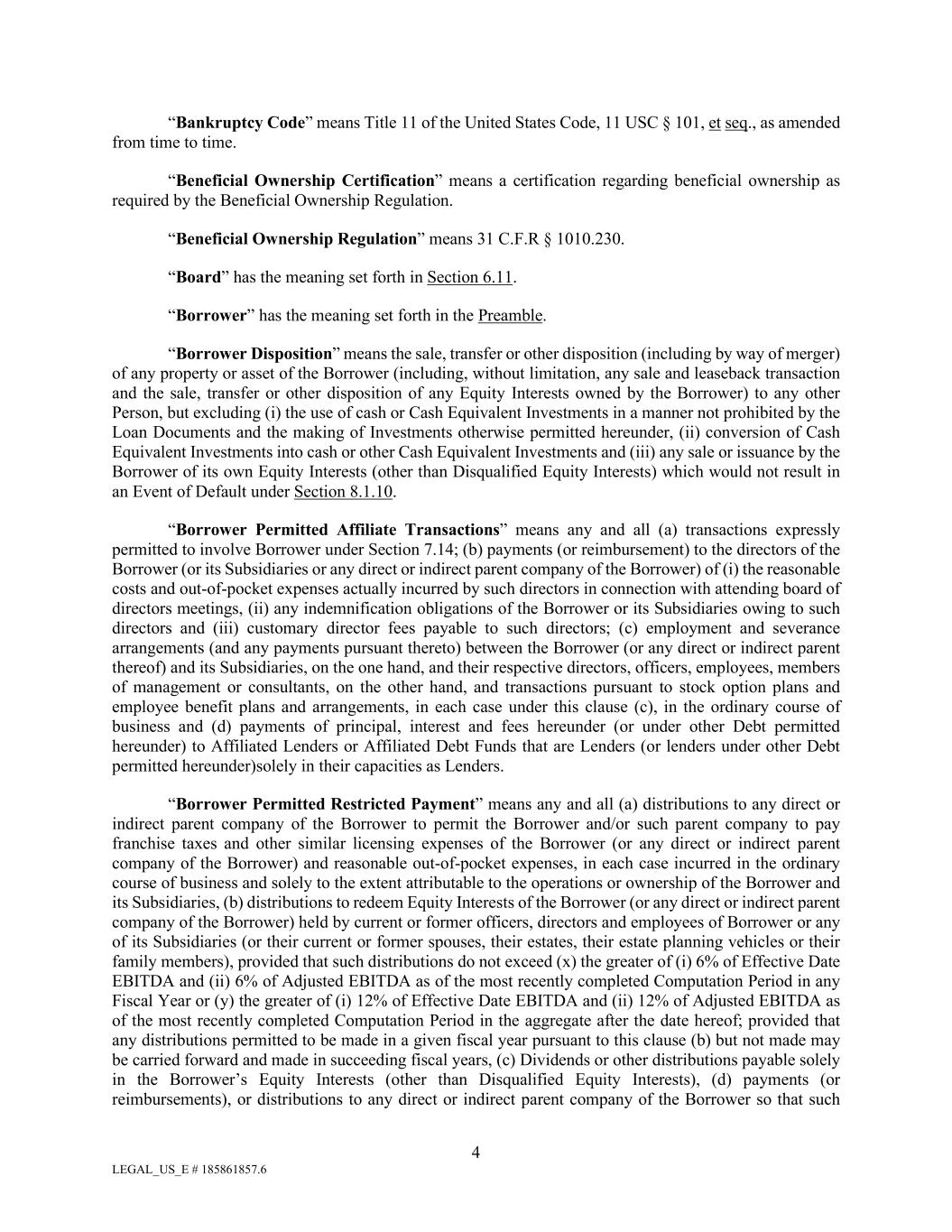 4 LEGAL_US_E # 185861857.6 “Bankruptcy Code” means Title 11 of the United States Code, 11 USC § 101, et seq., as amended from time to time. “Beneficial Ownership Certification” means a certification regarding beneficial ownership as required by the Beneficial Ownership Regulation. “Beneficial Ownership Regulation” means 31 C.F.R § 1010.230. “Board” has the meaning set forth in Section 6.11. “Borrower” has the meaning set forth in the Preamble. “Borrower Disposition” means the sale, transfer or other disposition (including by way of merger) of any property or asset of the Borrower (including, without limitation, any sale and leaseback transaction and the sale, transfer or other disposition of any Equity Interests owned by the Borrower) to any other Person, but excluding (i) the use of cash or Cash Equivalent Investments in a manner not prohibited by the Loan Documents and the making of Investments otherwise permitted hereunder, (ii) conversion of Cash Equivalent Investments into cash or other Cash Equivalent Investments and (iii) any sale or issuance by the Borrower of its own Equity Interests (other than Disqualified Equity Interests) which would not result in an Event of Default under Section 8.1.10. “Borrower Permitted Affiliate Transactions” means any and all (a) transactions expressly permitted to involve Borrower under Section 7.14; (b) payments (or reimbursement) to the directors of the Borrower (or its Subsidiaries or any direct or indirect parent company of the Borrower) of (i) the reasonable costs and out-of-pocket expenses actually incurred by such directors in connection with attending board of directors meetings, (ii) any indemnification obligations of the Borrower or its Subsidiaries owing to such directors and (iii) customary director fees payable to such directors; (c) employment and severance arrangements (and any payments pursuant thereto) between the Borrower (or any direct or indirect parent thereof) and its Subsidiaries, on the one hand, and their respective directors, officers, employees, members of management or consultants, on the other hand, and transactions pursuant to stock option plans and employee benefit plans and arrangements, in each case under this clause (c), in the ordinary course of business and (d) payments of principal, interest and fees hereunder (or under other Debt permitted hereunder) to Affiliated Lenders or Affiliated Debt Funds that are Lenders (or lenders under other Debt permitted hereunder)solely in their capacities as Lenders. “Borrower Permitted Restricted Payment” means any and all (a) distributions to any direct or indirect parent company of the Borrower to permit the Borrower and/or such parent company to pay franchise taxes and other similar licensing expenses of the Borrower (or any direct or indirect parent company of the Borrower) and reasonable out-of-pocket expenses, in each case incurred in the ordinary course of business and solely to the extent attributable to the operations or ownership of the Borrower and its Subsidiaries, (b) distributions to redeem Equity Interests of the Borrower (or any direct or indirect parent company of the Borrower) held by current or former officers, directors and employees of Borrower or any of its Subsidiaries (or their current or former spouses, their estates, their estate planning vehicles or their family members), provided that such distributions do not exceed (x) the greater of (i) 6% of Effective Date EBITDA and (ii) 6% of Adjusted EBITDA as of the most recently completed Computation Period in any Fiscal Year or (y) the greater of (i) 12% of Effective Date EBITDA and (ii) 12% of Adjusted EBITDA as of the most recently completed Computation Period in the aggregate after the date hereof; provided that any distributions permitted to be made in a given fiscal year pursuant to this clause (b) but not made may be carried forward and made in succeeding fiscal years, (c) Dividends or other distributions payable solely in the Borrower’s Equity Interests (other than Disqualified Equity Interests), (d) payments (or reimbursements), or distributions to any direct or indirect parent company of the Borrower so that such