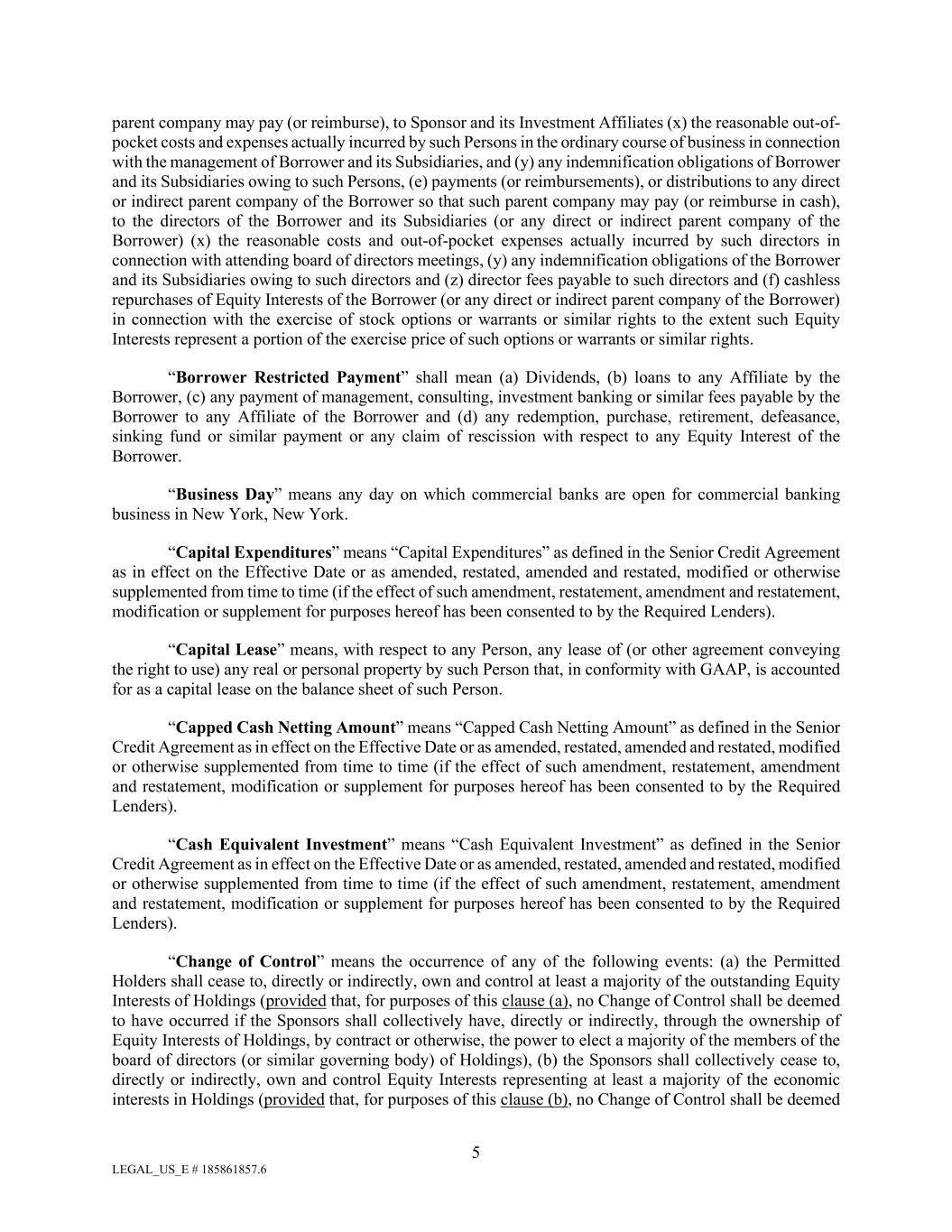 5 LEGAL_US_E # 185861857.6 parent company may pay (or reimburse), to Sponsor and its Investment Affiliates (x) the reasonable out-of- pocket costs and expenses actually incurred by such Persons in the ordinary course of business in connection with the management of Borrower and its Subsidiaries, and (y) any indemnification obligations of Borrower and its Subsidiaries owing to such Persons, (e) payments (or reimbursements), or distributions to any direct or indirect parent company of the Borrower so that such parent company may pay (or reimburse in cash), to the directors of the Borrower and its Subsidiaries (or any direct or indirect parent company of the Borrower) (x) the reasonable costs and out-of-pocket expenses actually incurred by such directors in connection with attending board of directors meetings, (y) any indemnification obligations of the Borrower and its Subsidiaries owing to such directors and (z) director fees payable to such directors and (f) cashless repurchases of Equity Interests of the Borrower (or any direct or indirect parent company of the Borrower) in connection with the exercise of stock options or warrants or similar rights to the extent such Equity Interests represent a portion of the exercise price of such options or warrants or similar rights. “Borrower Restricted Payment” shall mean (a) Dividends, (b) loans to any Affiliate by the Borrower, (c) any payment of management, consulting, investment banking or similar fees payable by the Borrower to any Affiliate of the Borrower and (d) any redemption, purchase, retirement, defeasance, sinking fund or similar payment or any claim of rescission with respect to any Equity Interest of the Borrower. “Business Day” means any day on which commercial banks are open for commercial banking business in New York, New York. “Capital Expenditures” means “Capital Expenditures” as defined in the Senior Credit Agreement as in effect on the Effective Date or as amended, restated, amended and restated, modified or otherwise supplemented from time to time (if the effect of such amendment, restatement, amendment and restatement, modification or supplement for purposes hereof has been consented to by the Required Lenders). “Capital Lease” means, with respect to any Person, any lease of (or other agreement conveying the right to use) any real or personal property by such Person that, in conformity with GAAP, is accounted for as a capital lease on the balance sheet of such Person. “Capped Cash Netting Amount” means “Capped Cash Netting Amount” as defined in the Senior Credit Agreement as in effect on the Effective Date or as amended, restated, amended and restated, modified or otherwise supplemented from time to time (if the effect of such amendment, restatement, amendment and restatement, modification or supplement for purposes hereof has been consented to by the Required Lenders). “Cash Equivalent Investment” means “Cash Equivalent Investment” as defined in the Senior Credit Agreement as in effect on the Effective Date or as amended, restated, amended and restated, modified or otherwise supplemented from time to time (if the effect of such amendment, restatement, amendment and restatement, modification or supplement for purposes hereof has been consented to by the Required Lenders). “Change of Control” means the occurrence of any of the following events: (a) the Permitted Holders shall cease to, directly or indirectly, own and control at least a majority of the outstanding Equity Interests of Holdings (provided that, for purposes of this clause (a), no Change of Control shall be deemed to have occurred if the Sponsors shall collectively have, directly or indirectly, through the ownership of Equity Interests of Holdings, by contract or otherwise, the power to elect a majority of the members of the board of directors (or similar governing body) of Holdings), (b) the Sponsors shall collectively cease to, directly or indirectly, own and control Equity Interests representing at least a majority of the economic interests in Holdings (provided that, for purposes of this clause (b), no Change of Control shall be deemed