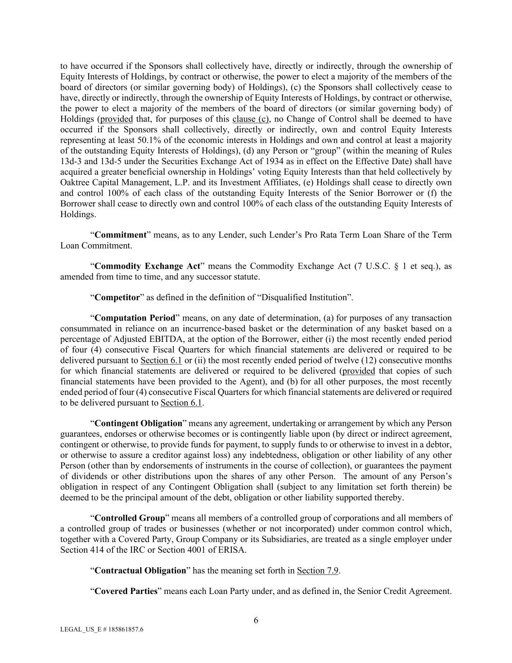 6 LEGAL_US_E # 185861857.6 to have occurred if the Sponsors shall collectively have, directly or indirectly, through the ownership of Equity Interests of Holdings, by contract or otherwise, the power to elect a majority of the members of the board of directors (or similar governing body) of Holdings), (c) the Sponsors shall collectively cease to have, directly or indirectly, through the ownership of Equity Interests of Holdings, by contract or otherwise, the power to elect a majority of the members of the board of directors (or similar governing body) of Holdings (provided that, for purposes of this clause (c), no Change of Control shall be deemed to have occurred if the Sponsors shall collectively, directly or indirectly, own and control Equity Interests representing at least 50.1% of the economic interests in Holdings and own and control at least a majority of the outstanding Equity Interests of Holdings), (d) any Person or “group” (within the meaning of Rules 13d-3 and 13d-5 under the Securities Exchange Act of 1934 as in effect on the Effective Date) shall have acquired a greater beneficial ownership in Holdings’ voting Equity Interests than that held collectively by Oaktree Capital Management, L.P. and its Investment Affiliates, (e) Holdings shall cease to directly own and control 100% of each class of the outstanding Equity Interests of the Senior Borrower or (f) the Borrower shall cease to directly own and control 100% of each class of the outstanding Equity Interests of Holdings. “Commitment” means, as to any Lender, such Lender’s Pro Rata Term Loan Share of the Term Loan Commitment. “Commodity Exchange Act” means the Commodity Exchange Act (7 U.S.C. § 1 et seq.), as amended from time to time, and any successor statute. “Competitor” as defined in the definition of “Disqualified Institution”. “Computation Period” means, on any date of determination, (a) for purposes of any transaction consummated in reliance on an incurrence-based basket or the determination of any basket based on a percentage of Adjusted EBITDA, at the option of the Borrower, either (i) the most recently ended period of four (4) consecutive Fiscal Quarters for which financial statements are delivered or required to be delivered pursuant to Section 6.1 or (ii) the most recently ended period of twelve (12) consecutive months for which financial statements are delivered or required to be delivered (provided that copies of such financial statements have been provided to the Agent), and (b) for all other purposes, the most recently ended period of four (4) consecutive Fiscal Quarters for which financial statements are delivered or required to be delivered pursuant to Section 6.1. “Contingent Obligation” means any agreement, undertaking or arrangement by which any Person guarantees, endorses or otherwise becomes or is contingently liable upon (by direct or indirect agreement, contingent or otherwise, to provide funds for payment, to supply funds to or otherwise to invest in a debtor, or otherwise to assure a creditor against loss) any indebtedness, obligation or other liability of any other Person (other than by endorsements of instruments in the course of collection), or guarantees the payment of dividends or other distributions upon the shares of any other Person. The amount of any Person’s obligation in respect of any Contingent Obligation shall (subject to any limitation set forth therein) be deemed to be the principal amount of the debt, obligation or other liability supported thereby. “Controlled Group” means all members of a controlled group of corporations and all members of a controlled group of trades or businesses (whether or not incorporated) under common control which, together with a Covered Party, Group Company or its Subsidiaries, are treated as a single employer under Section 414 of the IRC or Section 4001 of ERISA. “Contractual Obligation” has the meaning set forth in Section 7.9. “Covered Parties” means each Loan Party under, and as defined in, the Senior Credit Agreement.