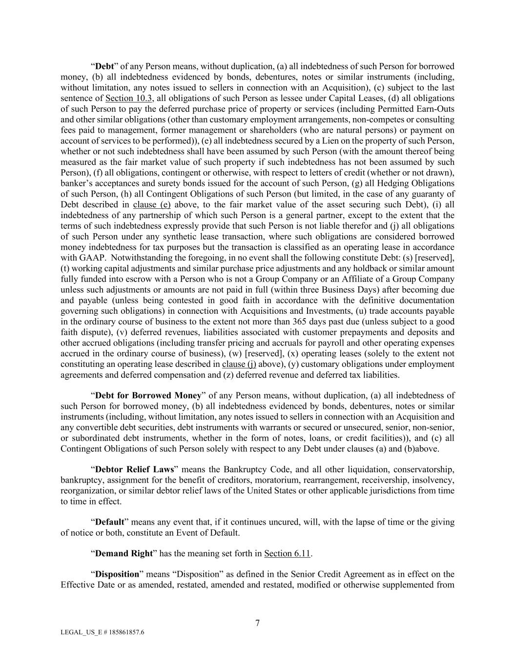7 LEGAL_US_E # 185861857.6 “Debt” of any Person means, without duplication, (a) all indebtedness of such Person for borrowed money, (b) all indebtedness evidenced by bonds, debentures, notes or similar instruments (including, without limitation, any notes issued to sellers in connection with an Acquisition), (c) subject to the last sentence of Section 10.3, all obligations of such Person as lessee under Capital Leases, (d) all obligations of such Person to pay the deferred purchase price of property or services (including Permitted Earn-Outs and other similar obligations (other than customary employment arrangements, non-competes or consulting fees paid to management, former management or shareholders (who are natural persons) or payment on account of services to be performed)), (e) all indebtedness secured by a Lien on the property of such Person, whether or not such indebtedness shall have been assumed by such Person (with the amount thereof being measured as the fair market value of such property if such indebtedness has not been assumed by such Person), (f) all obligations, contingent or otherwise, with respect to letters of credit (whether or not drawn), banker’s acceptances and surety bonds issued for the account of such Person, (g) all Hedging Obligations of such Person, (h) all Contingent Obligations of such Person (but limited, in the case of any guaranty of Debt described in clause (e) above, to the fair market value of the asset securing such Debt), (i) all indebtedness of any partnership of which such Person is a general partner, except to the extent that the terms of such indebtedness expressly provide that such Person is not liable therefor and (j) all obligations of such Person under any synthetic lease transaction, where such obligations are considered borrowed money indebtedness for tax purposes but the transaction is classified as an operating lease in accordance with GAAP. Notwithstanding the foregoing, in no event shall the following constitute Debt: (s) [reserved], (t) working capital adjustments and similar purchase price adjustments and any holdback or similar amount fully funded into escrow with a Person who is not a Group Company or an Affiliate of a Group Company unless such adjustments or amounts are not paid in full (within three Business Days) after becoming due and payable (unless being contested in good faith in accordance with the definitive documentation governing such obligations) in connection with Acquisitions and Investments, (u) trade accounts payable in the ordinary course of business to the extent not more than 365 days past due (unless subject to a good faith dispute), (v) deferred revenues, liabilities associated with customer prepayments and deposits and other accrued obligations (including transfer pricing and accruals for payroll and other operating expenses accrued in the ordinary course of business), (w) [reserved], (x) operating leases (solely to the extent not constituting an operating lease described in clause (j) above), (y) customary obligations under employment agreements and deferred compensation and (z) deferred revenue and deferred tax liabilities. “Debt for Borrowed Money” of any Person means, without duplication, (a) all indebtedness of such Person for borrowed money, (b) all indebtedness evidenced by bonds, debentures, notes or similar instruments (including, without limitation, any notes issued to sellers in connection with an Acquisition and any convertible debt securities, debt instruments with warrants or secured or unsecured, senior, non-senior, or subordinated debt instruments, whether in the form of notes, loans, or credit facilities)), and (c) all Contingent Obligations of such Person solely with respect to any Debt under clauses (a) and (b)above. “Debtor Relief Laws” means the Bankruptcy Code, and all other liquidation, conservatorship, bankruptcy, assignment for the benefit of creditors, moratorium, rearrangement, receivership, insolvency, reorganization, or similar debtor relief laws of the United States or other applicable jurisdictions from time to time in effect. “Default” means any event that, if it continues uncured, will, with the lapse of time or the giving of notice or both, constitute an Event of Default. “Demand Right” has the meaning set forth in Section 6.11. “Disposition” means “Disposition” as defined in the Senior Credit Agreement as in effect on the Effective Date or as amended, restated, amended and restated, modified or otherwise supplemented from