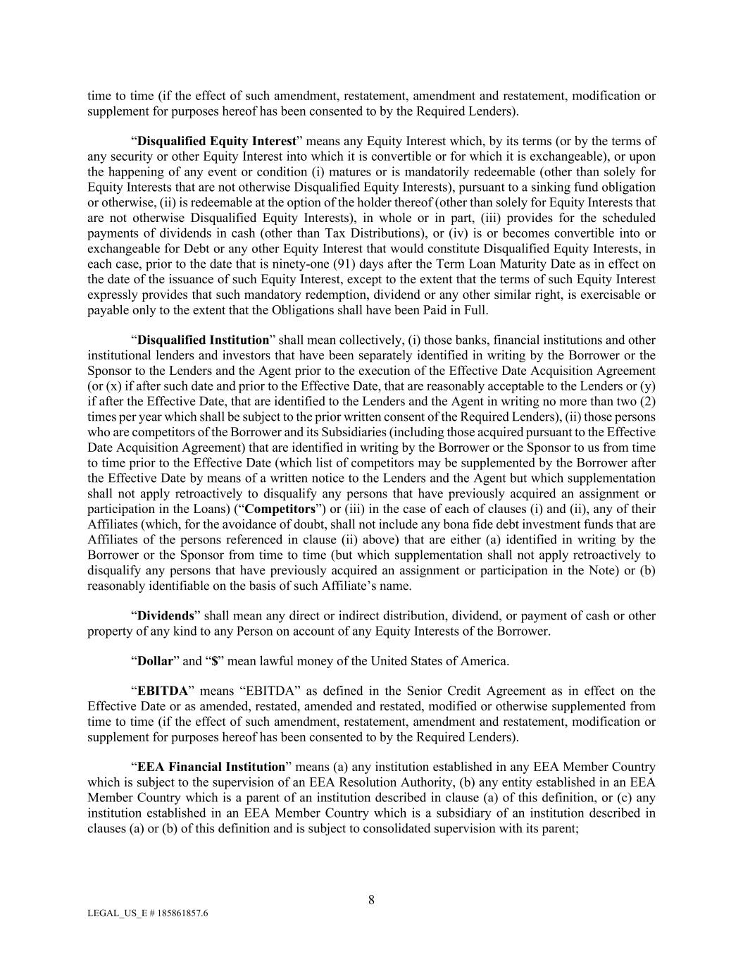 8 LEGAL_US_E # 185861857.6 time to time (if the effect of such amendment, restatement, amendment and restatement, modification or supplement for purposes hereof has been consented to by the Required Lenders). “Disqualified Equity Interest” means any Equity Interest which, by its terms (or by the terms of any security or other Equity Interest into which it is convertible or for which it is exchangeable), or upon the happening of any event or condition (i) matures or is mandatorily redeemable (other than solely for Equity Interests that are not otherwise Disqualified Equity Interests), pursuant to a sinking fund obligation or otherwise, (ii) is redeemable at the option of the holder thereof (other than solely for Equity Interests that are not otherwise Disqualified Equity Interests), in whole or in part, (iii) provides for the scheduled payments of dividends in cash (other than Tax Distributions), or (iv) is or becomes convertible into or exchangeable for Debt or any other Equity Interest that would constitute Disqualified Equity Interests, in each case, prior to the date that is ninety-one (91) days after the Term Loan Maturity Date as in effect on the date of the issuance of such Equity Interest, except to the extent that the terms of such Equity Interest expressly provides that such mandatory redemption, dividend or any other similar right, is exercisable or payable only to the extent that the Obligations shall have been Paid in Full. “Disqualified Institution” shall mean collectively, (i) those banks, financial institutions and other institutional lenders and investors that have been separately identified in writing by the Borrower or the Sponsor to the Lenders and the Agent prior to the execution of the Effective Date Acquisition Agreement (or (x) if after such date and prior to the Effective Date, that are reasonably acceptable to the Lenders or (y) if after the Effective Date, that are identified to the Lenders and the Agent in writing no more than two (2) times per year which shall be subject to the prior written consent of the Required Lenders), (ii) those persons who are competitors of the Borrower and its Subsidiaries (including those acquired pursuant to the Effective Date Acquisition Agreement) that are identified in writing by the Borrower or the Sponsor to us from time to time prior to the Effective Date (which list of competitors may be supplemented by the Borrower after the Effective Date by means of a written notice to the Lenders and the Agent but which supplementation shall not apply retroactively to disqualify any persons that have previously acquired an assignment or participation in the Loans) (“Competitors”) or (iii) in the case of each of clauses (i) and (ii), any of their Affiliates (which, for the avoidance of doubt, shall not include any bona fide debt investment funds that are Affiliates of the persons referenced in clause (ii) above) that are either (a) identified in writing by the Borrower or the Sponsor from time to time (but which supplementation shall not apply retroactively to disqualify any persons that have previously acquired an assignment or participation in the Note) or (b) reasonably identifiable on the basis of such Affiliate’s name. “Dividends” shall mean any direct or indirect distribution, dividend, or payment of cash or other property of any kind to any Person on account of any Equity Interests of the Borrower. “Dollar” and “$” mean lawful money of the United States of America. “EBITDA” means “EBITDA” as defined in the Senior Credit Agreement as in effect on the Effective Date or as amended, restated, amended and restated, modified or otherwise supplemented from time to time (if the effect of such amendment, restatement, amendment and restatement, modification or supplement for purposes hereof has been consented to by the Required Lenders). “EEA Financial Institution” means (a) any institution established in any EEA Member Country which is subject to the supervision of an EEA Resolution Authority, (b) any entity established in an EEA Member Country which is a parent of an institution described in clause (a) of this definition, or (c) any institution established in an EEA Member Country which is a subsidiary of an institution described in clauses (a) or (b) of this definition and is subject to consolidated supervision with its parent;