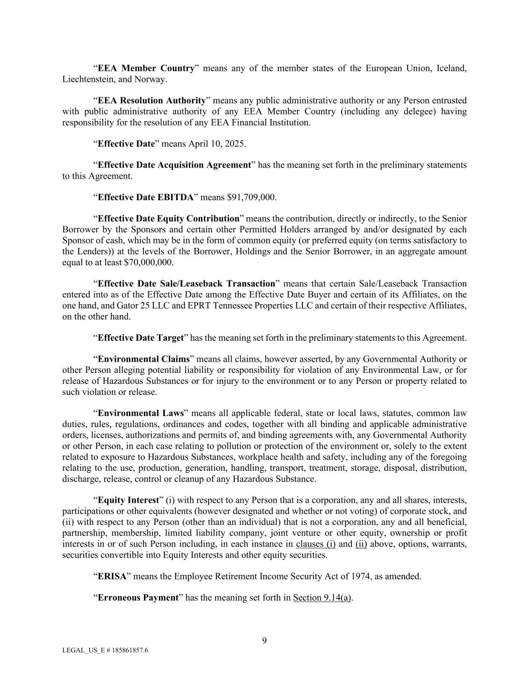 9 LEGAL_US_E # 185861857.6 “EEA Member Country” means any of the member states of the European Union, Iceland, Liechtenstein, and Norway. “EEA Resolution Authority” means any public administrative authority or any Person entrusted with public administrative authority of any EEA Member Country (including any delegee) having responsibility for the resolution of any EEA Financial Institution. “Effective Date” means April 10, 2025. “Effective Date Acquisition Agreement” has the meaning set forth in the preliminary statements to this Agreement. “Effective Date EBITDA” means $91,709,000. “Effective Date Equity Contribution” means the contribution, directly or indirectly, to the Senior Borrower by the Sponsors and certain other Permitted Holders arranged by and/or designated by each Sponsor of cash, which may be in the form of common equity (or preferred equity (on terms satisfactory to the Lenders)) at the levels of the Borrower, Holdings and the Senior Borrower, in an aggregate amount equal to at least $70,000,000. “Effective Date Sale/Leaseback Transaction” means that certain Sale/Leaseback Transaction entered into as of the Effective Date among the Effective Date Buyer and certain of its Affiliates, on the one hand, and Gator 25 LLC and EPRT Tennessee Properties LLC and certain of their respective Affiliates, on the other hand. “Effective Date Target” has the meaning set forth in the preliminary statements to this Agreement. “Environmental Claims” means all claims, however asserted, by any Governmental Authority or other Person alleging potential liability or responsibility for violation of any Environmental Law, or for release of Hazardous Substances or for injury to the environment or to any Person or property related to such violation or release. “Environmental Laws” means all applicable federal, state or local laws, statutes, common law duties, rules, regulations, ordinances and codes, together with all binding and applicable administrative orders, licenses, authorizations and permits of, and binding agreements with, any Governmental Authority or other Person, in each case relating to pollution or protection of the environment or, solely to the extent related to exposure to Hazardous Substances, workplace health and safety, including any of the foregoing relating to the use, production, generation, handling, transport, treatment, storage, disposal, distribution, discharge, release, control or cleanup of any Hazardous Substance. “Equity Interest” (i) with respect to any Person that is a corporation, any and all shares, interests, participations or other equivalents (however designated and whether or not voting) of corporate stock, and (ii) with respect to any Person (other than an individual) that is not a corporation, any and all beneficial, partnership, membership, limited liability company, joint venture or other equity, ownership or profit interests in or of such Person including, in each instance in clauses (i) and (ii) above, options, warrants, securities convertible into Equity Interests and other equity securities. “ERISA” means the Employee Retirement Income Security Act of 1974, as amended. “Erroneous Payment” has the meaning set forth in Section 9.14(a).