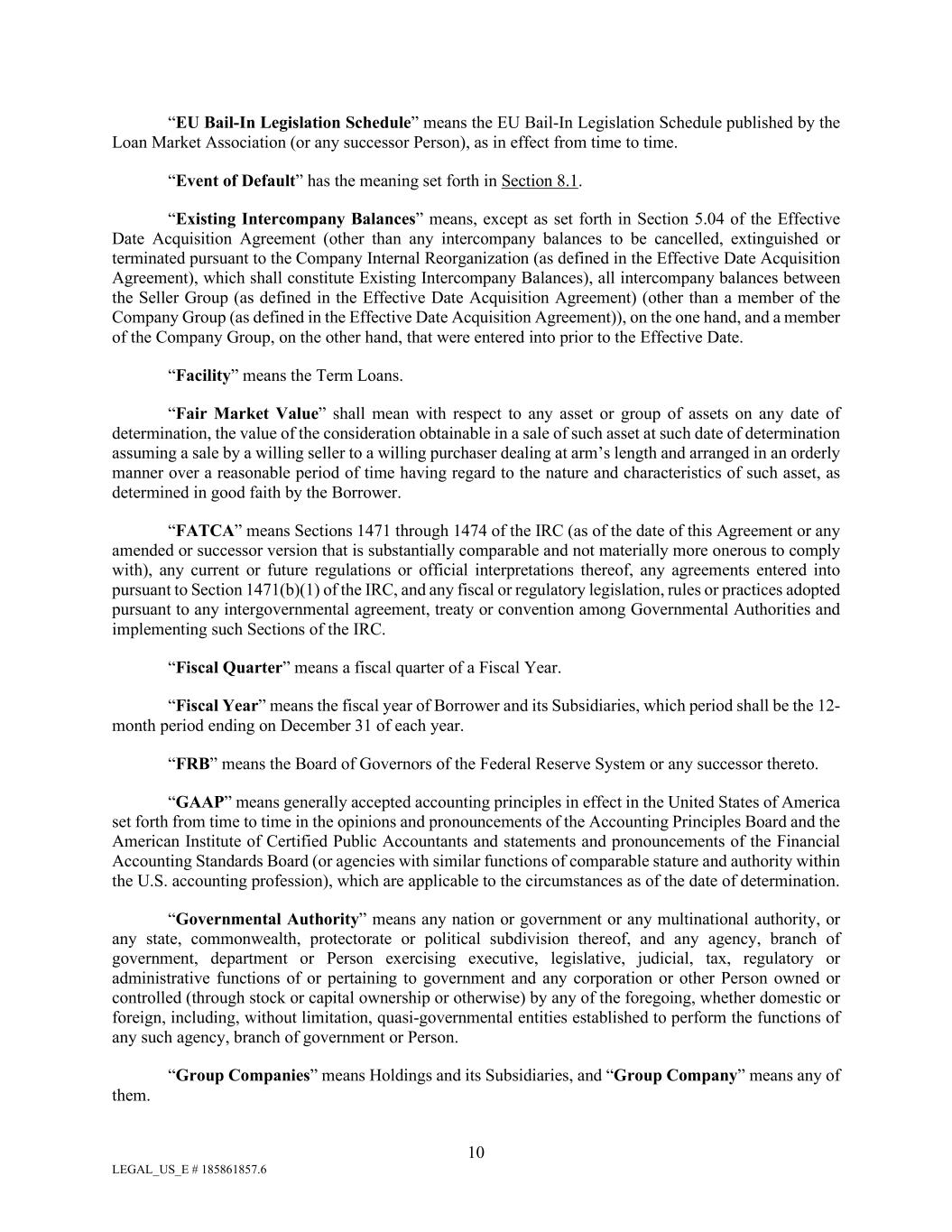 10 LEGAL_US_E # 185861857.6 “EU Bail-In Legislation Schedule” means the EU Bail-In Legislation Schedule published by the Loan Market Association (or any successor Person), as in effect from time to time. “Event of Default” has the meaning set forth in Section 8.1. “Existing Intercompany Balances” means, except as set forth in Section 5.04 of the Effective Date Acquisition Agreement (other than any intercompany balances to be cancelled, extinguished or terminated pursuant to the Company Internal Reorganization (as defined in the Effective Date Acquisition Agreement), which shall constitute Existing Intercompany Balances), all intercompany balances between the Seller Group (as defined in the Effective Date Acquisition Agreement) (other than a member of the Company Group (as defined in the Effective Date Acquisition Agreement)), on the one hand, and a member of the Company Group, on the other hand, that were entered into prior to the Effective Date. “Facility” means the Term Loans. “Fair Market Value” shall mean with respect to any asset or group of assets on any date of determination, the value of the consideration obtainable in a sale of such asset at such date of determination assuming a sale by a willing seller to a willing purchaser dealing at arm’s length and arranged in an orderly manner over a reasonable period of time having regard to the nature and characteristics of such asset, as determined in good faith by the Borrower. “FATCA” means Sections 1471 through 1474 of the IRC (as of the date of this Agreement or any amended or successor version that is substantially comparable and not materially more onerous to comply with), any current or future regulations or official interpretations thereof, any agreements entered into pursuant to Section 1471(b)(1) of the IRC, and any fiscal or regulatory legislation, rules or practices adopted pursuant to any intergovernmental agreement, treaty or convention among Governmental Authorities and implementing such Sections of the IRC. “Fiscal Quarter” means a fiscal quarter of a Fiscal Year. “Fiscal Year” means the fiscal year of Borrower and its Subsidiaries, which period shall be the 12- month period ending on December 31 of each year. “FRB” means the Board of Governors of the Federal Reserve System or any successor thereto. “GAAP” means generally accepted accounting principles in effect in the United States of America set forth from time to time in the opinions and pronouncements of the Accounting Principles Board and the American Institute of Certified Public Accountants and statements and pronouncements of the Financial Accounting Standards Board (or agencies with similar functions of comparable stature and authority within the U.S. accounting profession), which are applicable to the circumstances as of the date of determination. “Governmental Authority” means any nation or government or any multinational authority, or any state, commonwealth, protectorate or political subdivision thereof, and any agency, branch of government, department or Person exercising executive, legislative, judicial, tax, regulatory or administrative functions of or pertaining to government and any corporation or other Person owned or controlled (through stock or capital ownership or otherwise) by any of the foregoing, whether domestic or foreign, including, without limitation, quasi-governmental entities established to perform the functions of any such agency, branch of government or Person. “Group Companies” means Holdings and its Subsidiaries, and “Group Company” means any of them.